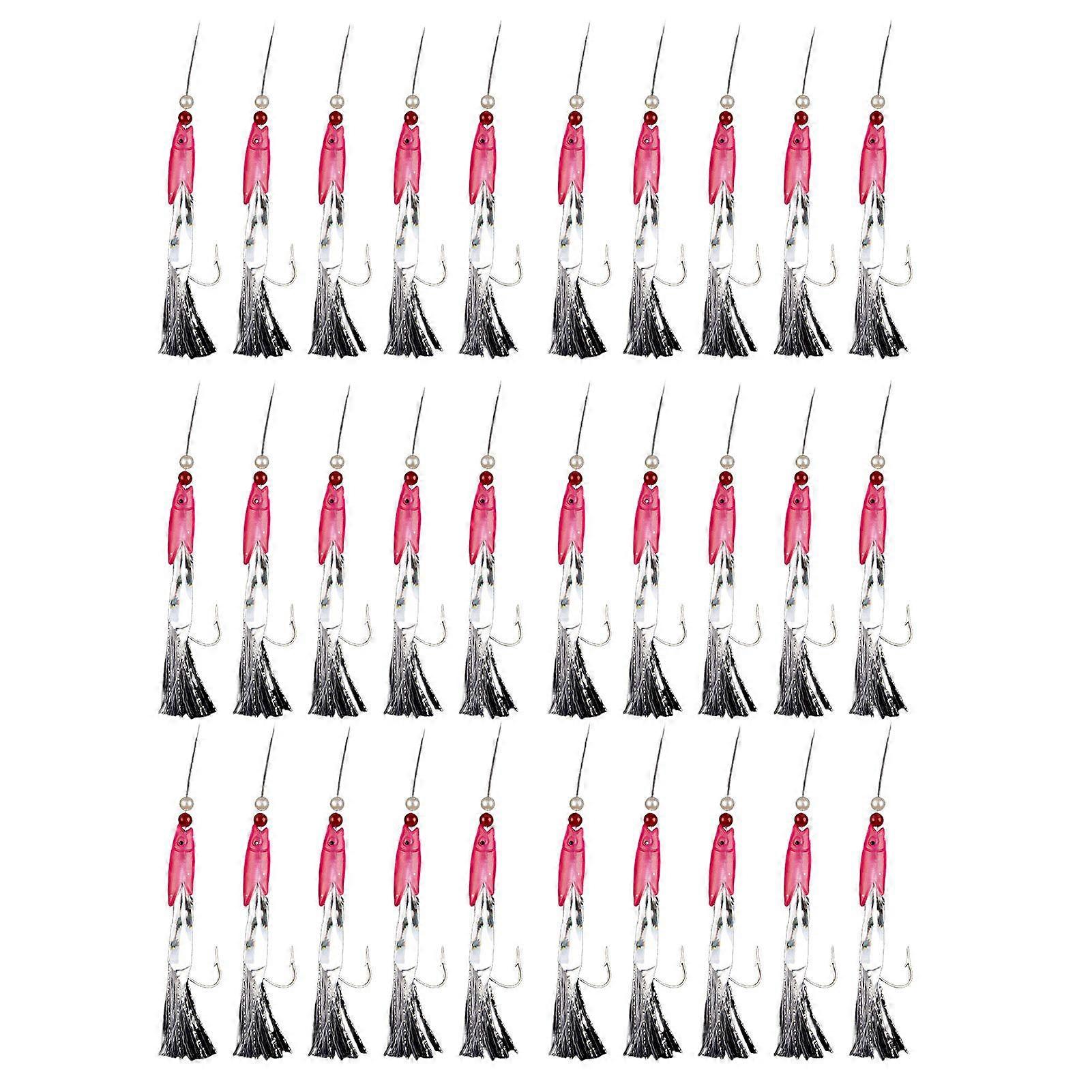 Enhanced Concealment: Crafted with transparent invisible nylon wire, this Sabiki Rig offers exceptional concealment underwater, increasing your fishing success by remaining undetected by fish. The durable and tough material ensures high resilience to fish tension, guaranteeing a smooth and stealthy fishing experience. Precision Hook Design: Featuring high carbon steel construction, the sharp-pointed hook swiftly pierces fish mouths, enhancing your fishing efficiency and reducing instances of fish escaping. This powerful hook design significantly boosts your chances of catching targeted fish during sea fishing expeditions. Premium Quality Construction: This set of Sabiki rigs, tailored for cod and various fish species, boasts top-notch quality and reliability in sea fishing tackle. Meticulously controlled material selection and manufacturing processes ensure consistent performance, empowering fishing enthusiasts with dependable gear for successful sea angling adventures. Hand-Tied Durability: Each hook is meticulously hand-tied to ensure superior durability and strength. Manual bundling enhances control over the connection between the hook and fishing line, preventing loosening or detachment during fishing activities. Enjoy a secure and reliable equipment setup that withstands rigorous fishing conditions. Luminous Fish Head Attraction: The luminous fish head, crafted from premium PVC material with innovative luminous elements, mimics a realistic appearance and attracts the attention of fish in water, especially in a darker environment, it can better exert its unique fish-attracting effect and increase the catch. Item Name: Sabiki Rig Material: PVC Features: Fishing Accessories, with Invisible Line, Luminous Size Details: Line Length: 164cm/64.57" (Approx.) Notes: Due to the light and screen setting difference, the item's color may be slightly different from the pictures. Please allow slight dimension difference due to different manual measurement. Package Includes: Pink 15 Pcs,Beige 15 Pcs: 15 x Sabiki Rigs or Pink 30PCS, Beige 30PCS: 30 x Sabiki Rigs