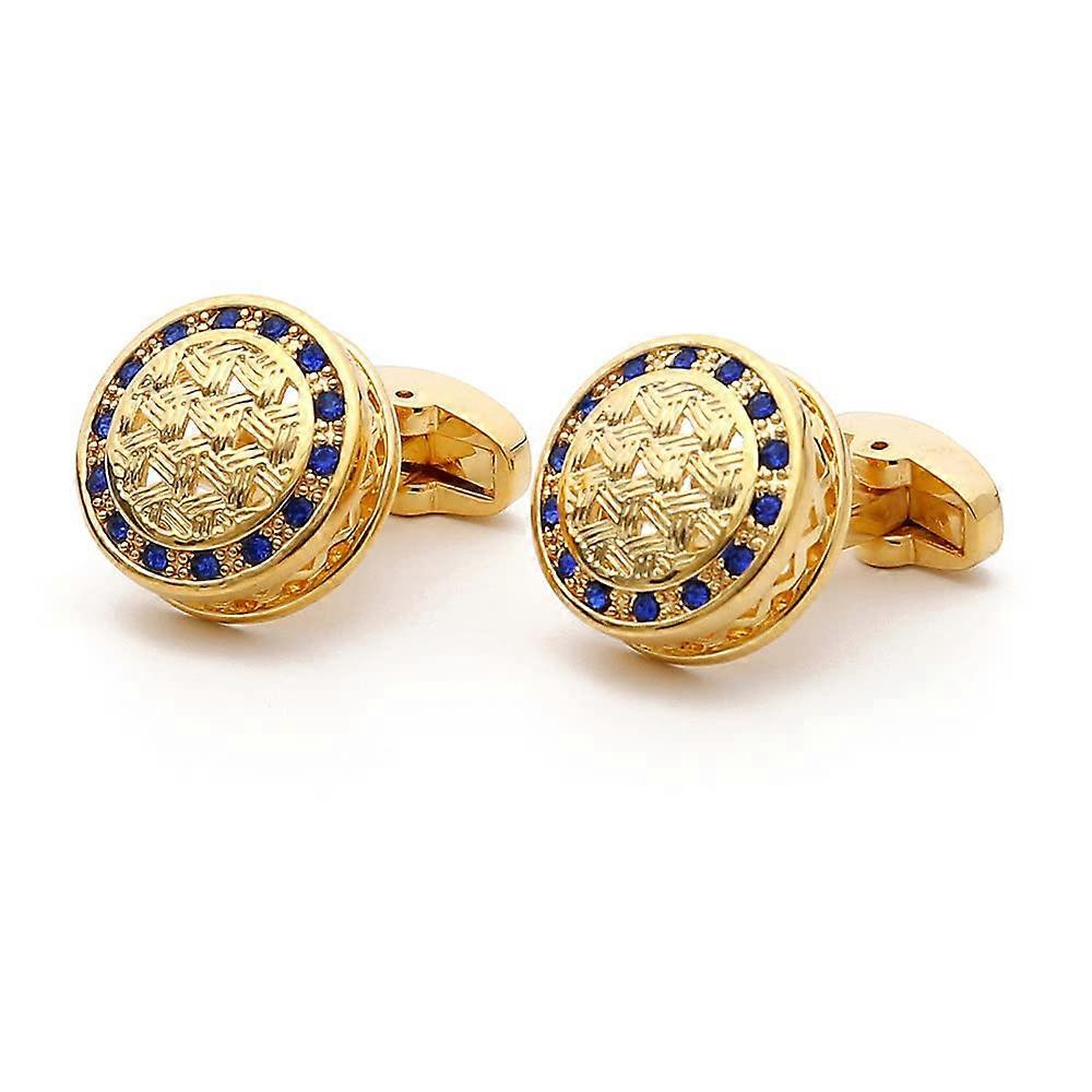 Men's cufflinks for dress shirts, lightweight, luxurious, with inlaid blue crystal, French, round, goldtoned