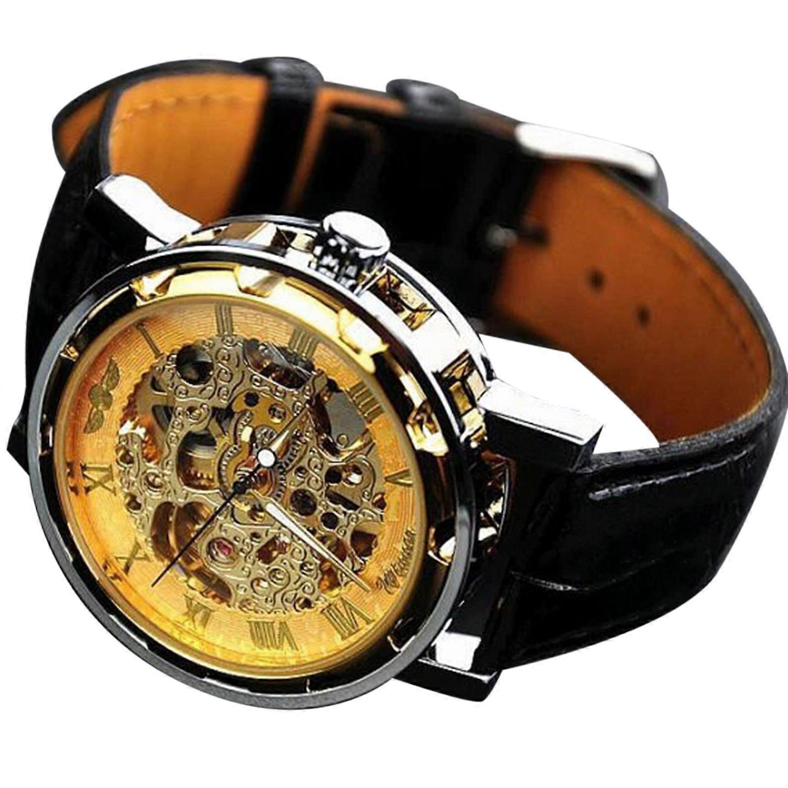 Men's Skeleton Mechanical Watch Steampunk Style Luxury Black Leather Stainless Steel