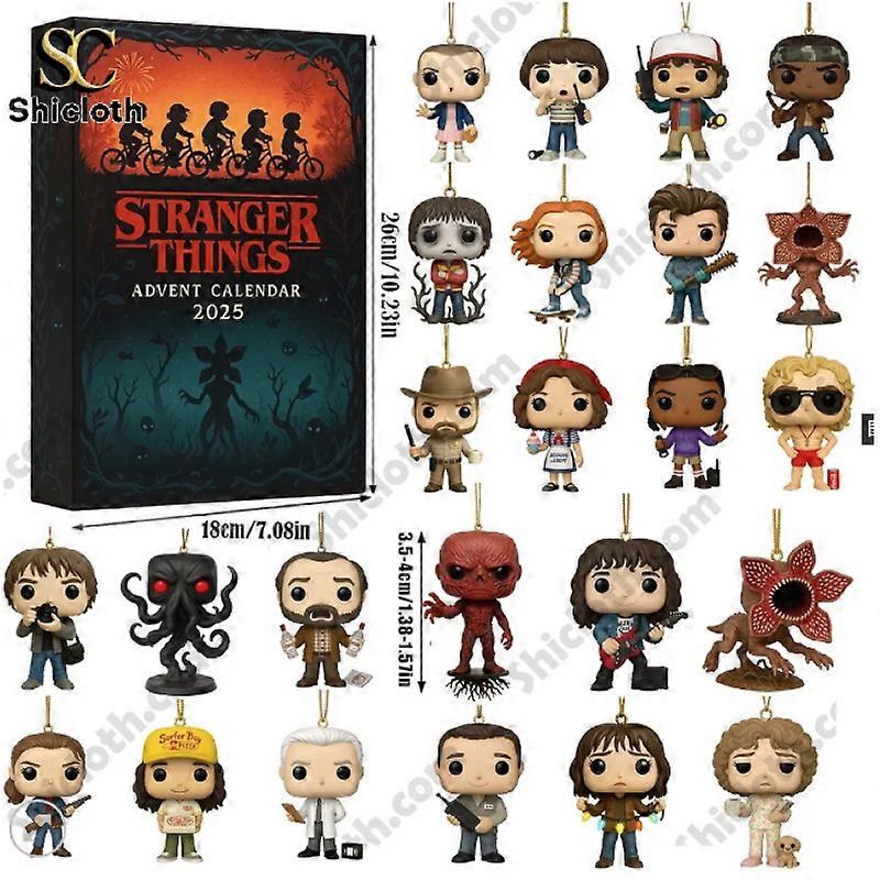 2025 24-day Stranger Things advent calendar: Blind box with themed Christmas tree decorations for fans. Durable plastic ornaments & sturdy cardboard calendar, featuring iconic show elements. Open one daily; keep small parts from kids under 3, clean with dry cloth, store in cool place.