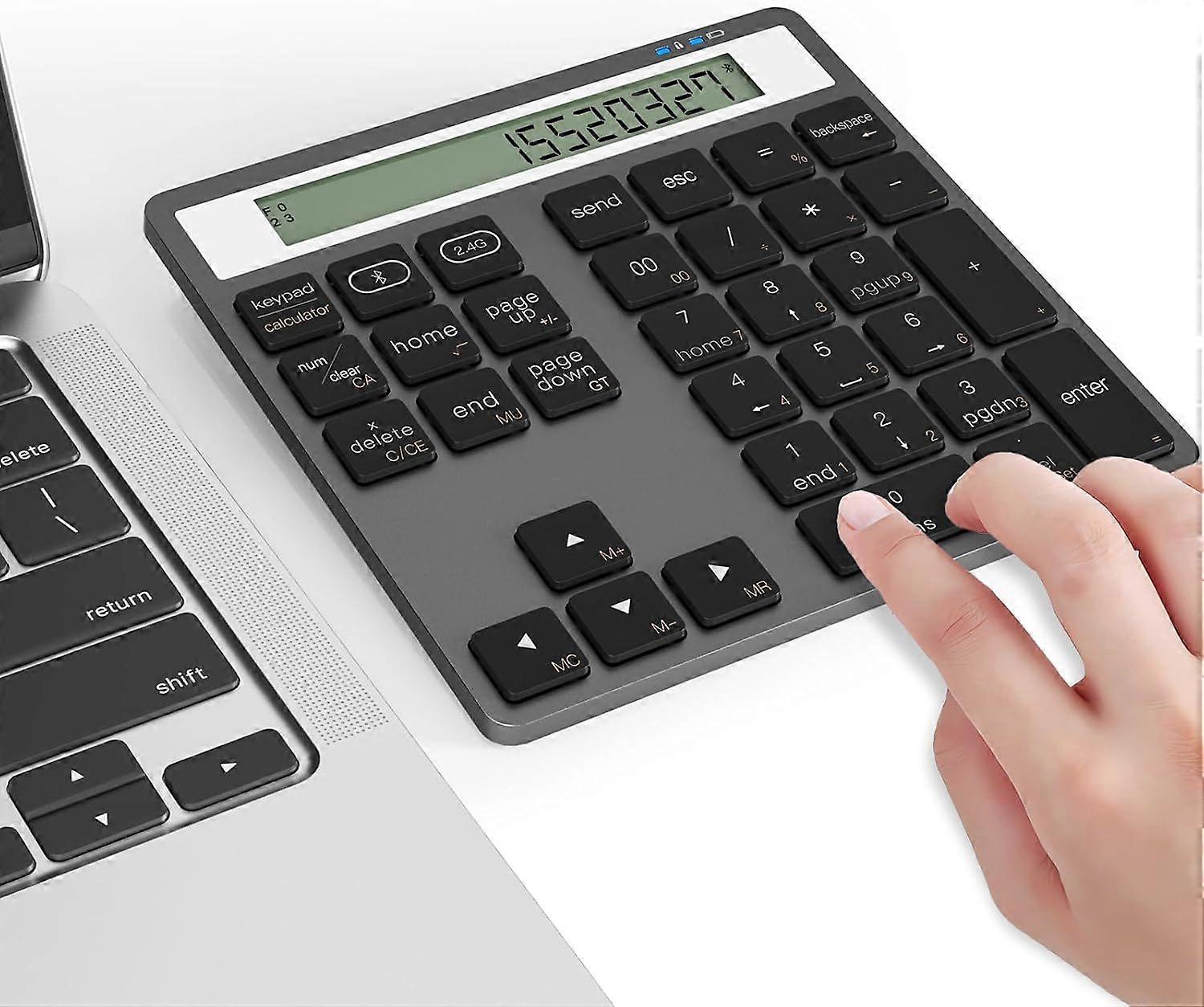 Connectivity & Plug-and-Play Convenience: Enjoy lag-free typing with dual Bluetooth 5.0 and 2.4G wireless modes for your laptop number keypad. The wireless numeric keypad pairs instantly (3-second pairing) and maintains stable 33ft range connectivity. Ultra-responsive keystrokes ensure smooth data input for MacBook, Surface Pro, and PC users alike.Ergonomic Design with Silent Typing: At 15 tilt angle, this bluetooth number pad for laptop features whisper-quiet scissor-switch keys and premium ABS construction. The ultra-thin wireless numpad (thinner than most smartphones) delivers comfortable touch-typing while its auto-sleep function extends AAA battery life - wakes with any keystroke within 3s.Universal Compatibility Across Devices: This numeric keypad bluetooth works flawlessly with Windows/Mac/iOS/Android/Chrome OS. Use it as a wireless keypad for laptop (MacBook Air/Pro, Surface), desktop, or even smartphone. Compact enough for travel yet sturdy for office - includes battery compartment (2xAAA required).Dual-Mode Wireless Number Pad & Bluetooth Calculator: Experience versatility with this 2-in-1 Bluetooth numeric keypad that seamlessly switches between number pad and numpad calculator modes. The 34-key layout features dedicated keys (NumLock/ESC/00/Delete) and a calculator toggle, making it perfect for accounting professionals, students, and Excel power users needing efficient data entry.Complete Package with Premium Support: Get more than just a Bluetooth calculator keypad - includes a user manual, 24-month warranty, and dedicated customer service. Ideal gift for accountants, programmers, and anyone needing portable numeric keypads for laptop productivity boost!