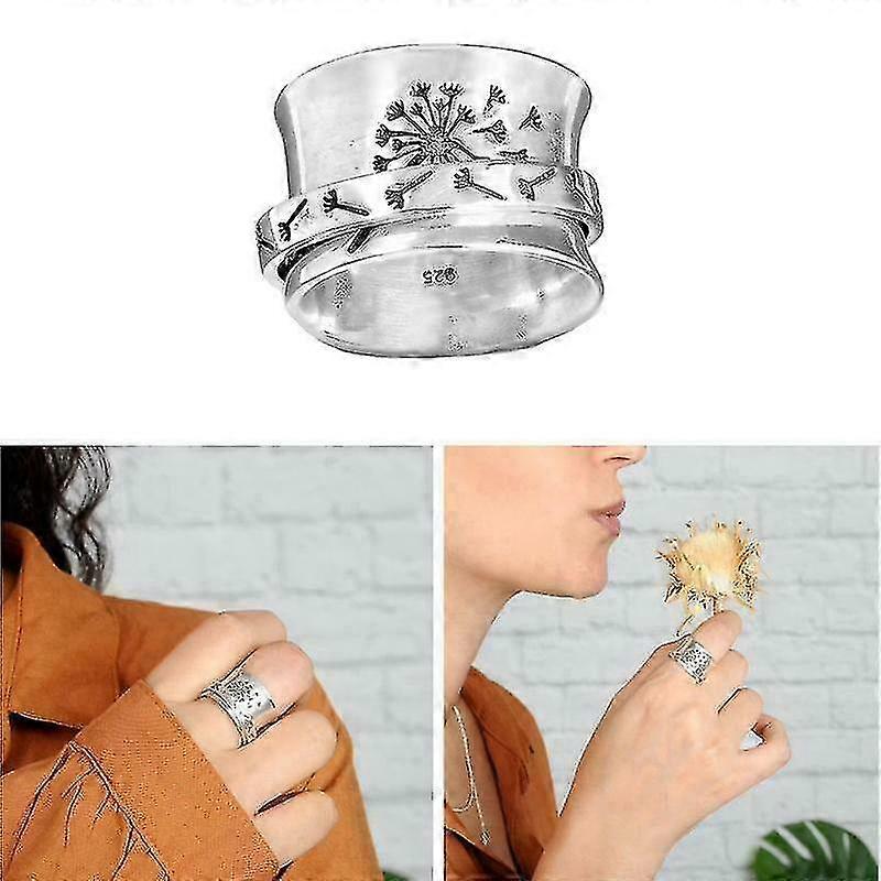Dandelion Flower Spin Silver Meditation Ring , Relief Fidget & Anxiety Wide Band