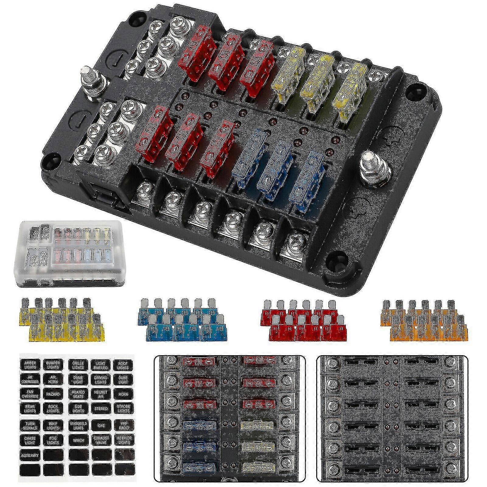 12 Way 12V-24V Car Power Distribution Blade Fuse Holder Box Block Panel Fuses12 Way Blade Fuse Box Features:LED Warning Indicator: This 12 Way Blade Fuse Box with negative bus can easily identify and replace blown fuses immediately without guessingThe LED indicator lights up when a blown fuse is detected. It is both safe and easy for you to check and replace the blown fuse.Wide Usage: This 12 Way Blade Fuse Box with ground is suitable for all vehicles with a 10-32 Volt DC power source. So it come with multi-function stickers for DIY your specific need, 12 Way Blade Fuse Box convenient for examination and repair, easy to troubleshoot in outdoor; widely used in vehicle, car, marine , bus, ship, tanker, subway etc.Quality: The 12 way 12 Way Blade Fuse Box with ground buss is crafted to perfection with the best quality materials and with special attention to detail so it can be incredibly efficient and durable.Easy to Set Up: No need to worry about getting your fuse box ready to use. This 6 circuit 12 Way Blade Fuse Box with ground is very easy to install.With Cover and Fuse: Transparent plastic cover with push latch system, easy to operate, splash and dust-proof design. Adds extra protection to your fuse box \u0026 fuses. With 24 pcs Blade fuse 6 x 5A, 6 x 10A 6 x 15A, 6 x 20A.12 Way Blade Fuse Box Specification:Type : 12-Way 12 Way Blade Fuse Box12 Way Blade Fuse Box Color : Black12 Way Blade Fuse Box Model : 12-Way 12 Way Blade Fuse Box12 Way Blade Fuse Box Size : 138.25*85*36.5mm12 Way Blade Fuse Box Input Rated Voltage : 32V12 Way Blade Fuse Box Input Rated Current : 100A12 Way Blade Fuse Box Maximum Output Current : 30A max per circuit12 Way Blade Fuse Box Input Wire Size :4-6 AWG12 Way Blade Fuse Box Output Wire Size :12-16 AWG12 Way Blade Fuse Box Main Line Terminal : M5 threaded stud12 Way Blade Fuse Box Single Wire Terminal : M4 threaded stud12 Way Blade Fuse Box LED Indicator : Red LED indicates when fuse is burnoutPackage Includes:1 x 12 Way 12 Way Blade Fuse Box6 x 20A Fuse6 x 15A Fuse6 x 10A Fuse6 x 5A Fuse4 x Self-Tapping Screws1 x Sticker