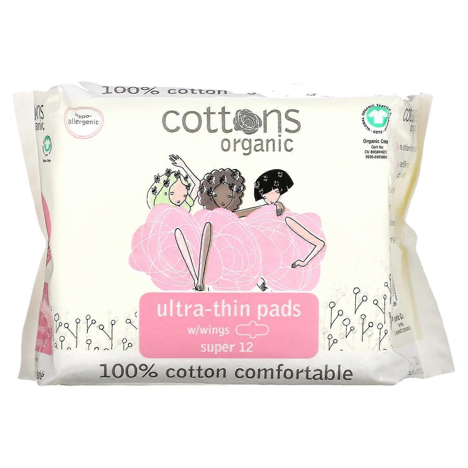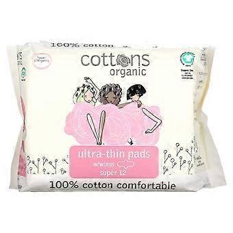 Cottons, 100% Natural Cotton Coversheet, Ultra-Thin Pads with Wings, Super, 12 Pads