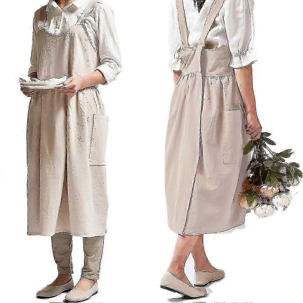 Cotton Linen Cross Back Apron For Women With Pockets For Cooking Gardening Without Waist Ties
