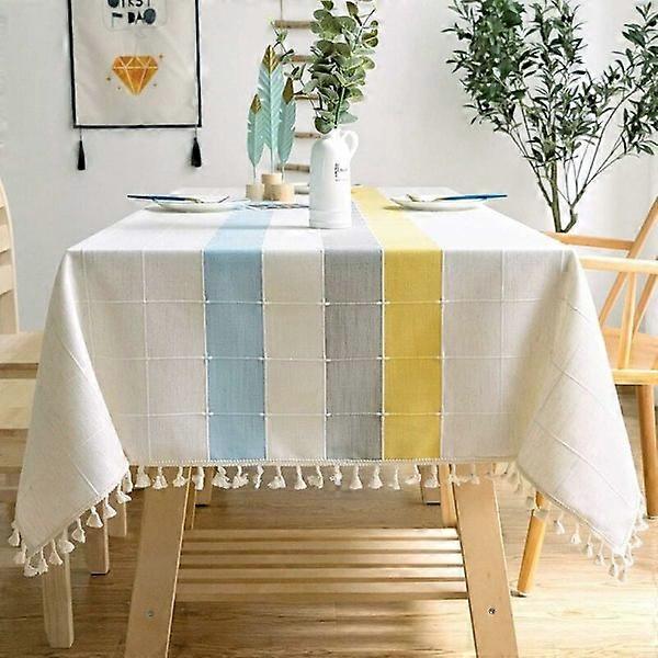 Cotton and Linen Rectangular Tablecloth Solid Plaid Embroidery Tassels Cotton Linen Table Cover for Kitchen Dining Table Decoration (140x300cm, Blue