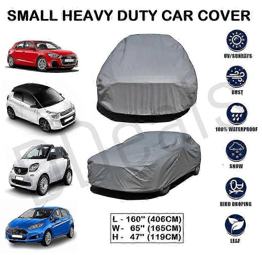 HEAVY DUTY CAR PROTECTION COVER Protect your investment/asset with these heavy duty waterproof car covers. Your vehicle will have MAXIMUM PROTECTION from snow, acidic rain, dust, UV rays & bird droppings. These covers are suitable for indoor and outdoor use ensuring MAXIMUM PROTECTION in all weather conditions. Features: - Toughened fully waterproof polyester coating - Soft cotton lining to prevent damage to paint work - Double seamed stitching - Elasticated hem for snug fit - FREE storage bag included - 4x tie down straps to secure the cover Dimensions: Length - 160'' (406cm) Width - 65'' (165cm) Height - 47'' (119cm) Weight - 4kg OTHER SIZES ALSO AVAILABLE If unsure about fitment or anything else, feel free to