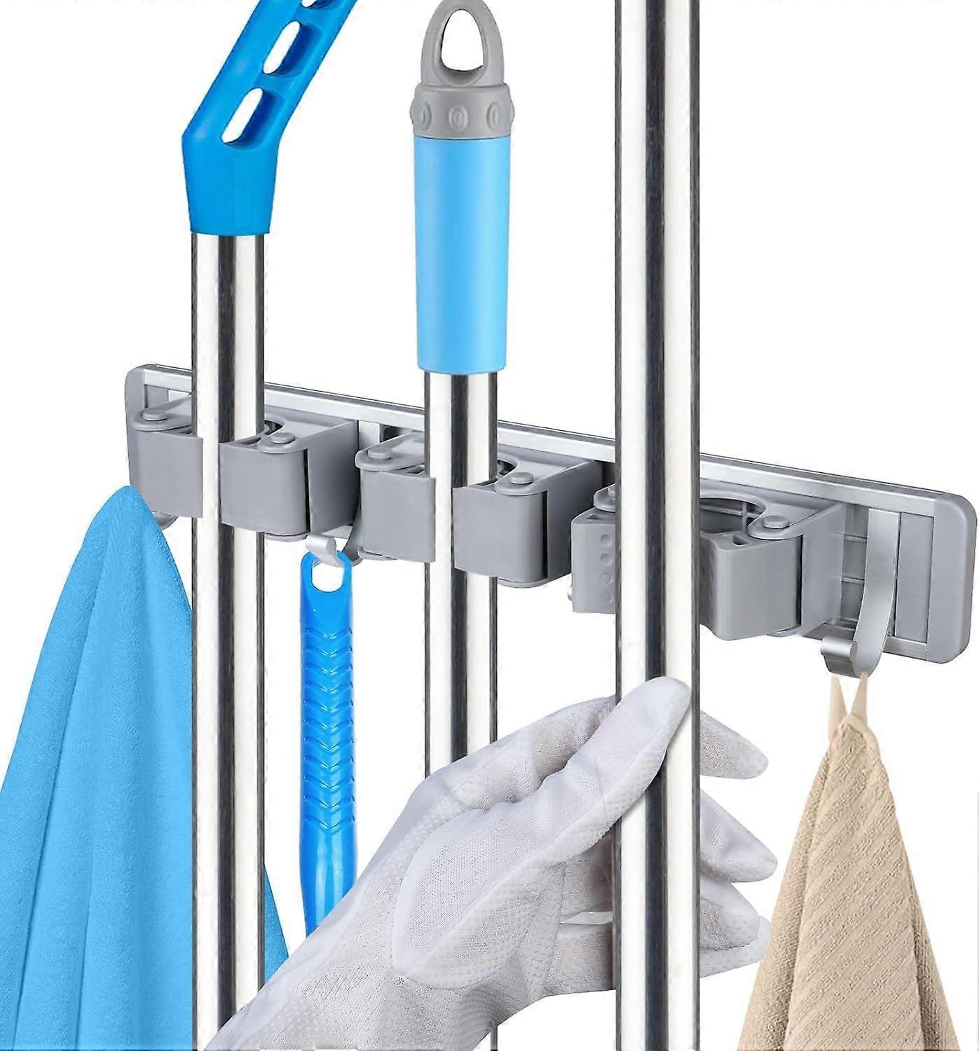 Wall Mounted Broom Holder, Wall Mounted Mop Holder Mop and Broom Holder with 3 Slots and 4 Hooks Holder for Home, Kitchen, Garage, Garden