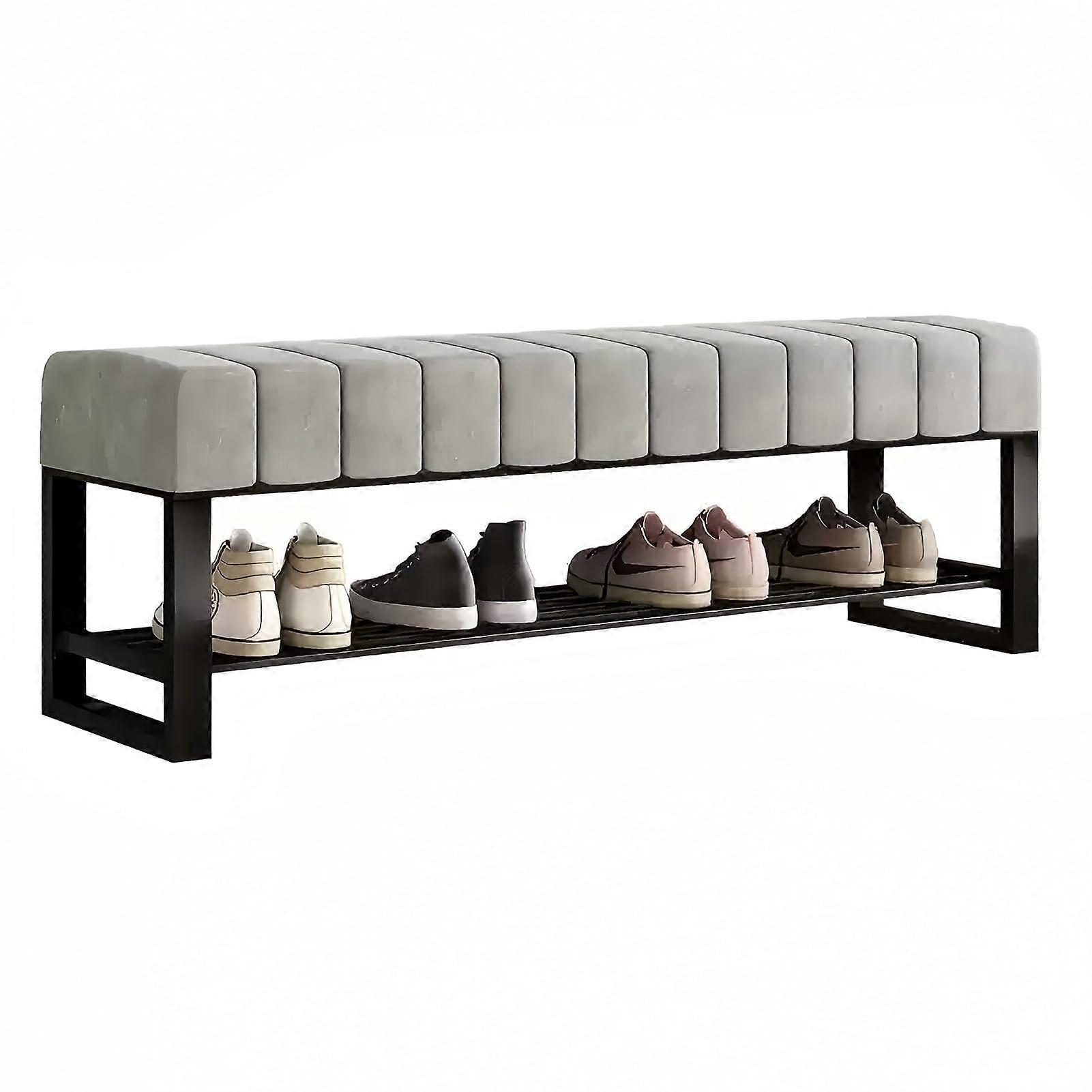 Velvet Upholstered Shoe Bench with 2Tier Storage Shelf for Entryway, Bedroom, Hallway, Gray 100x32x45cm