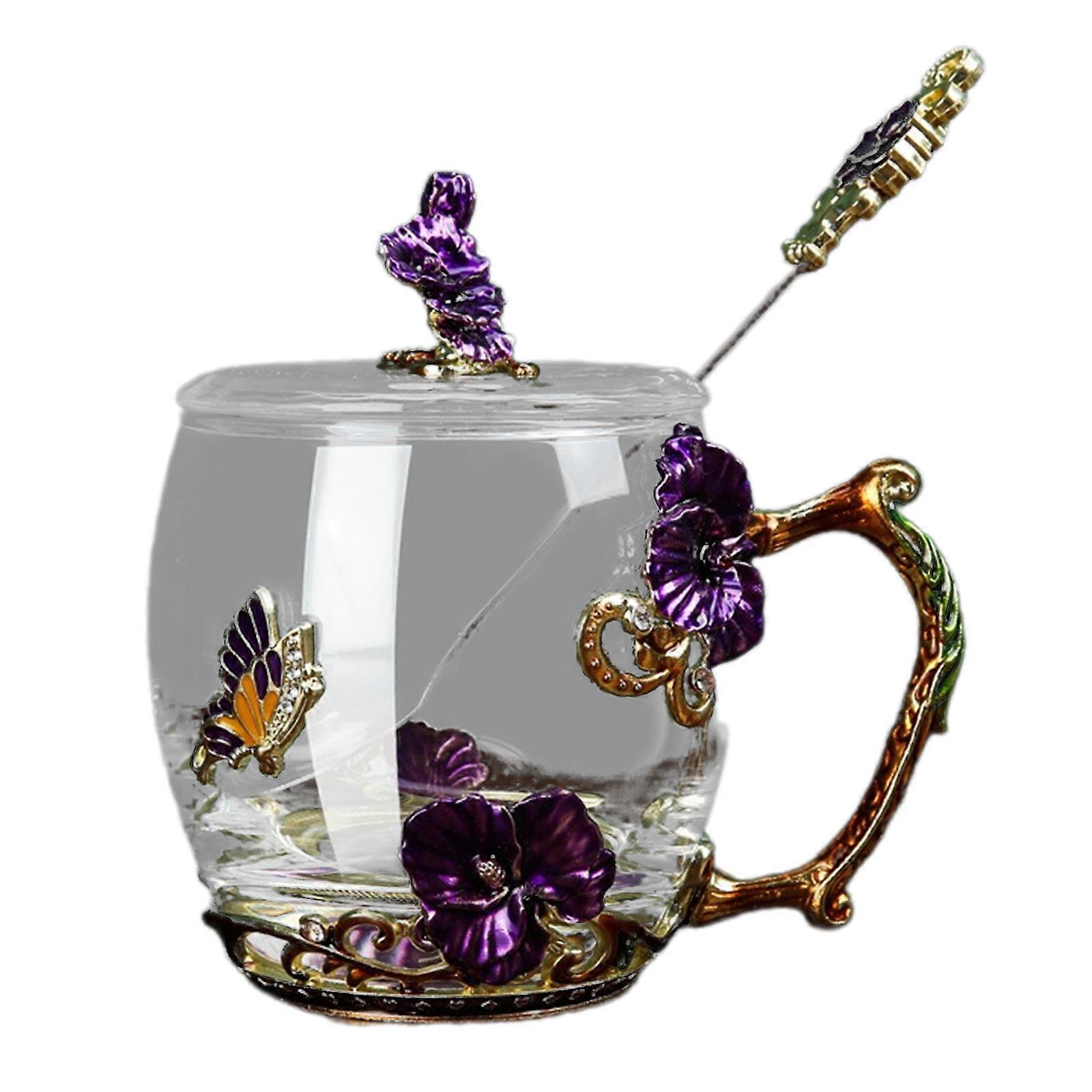 Enamel Glass Cup Set Pattern Glass Cup with Spoon Enamel Cup Milk Lemon Flower Butterflies Cup Purple