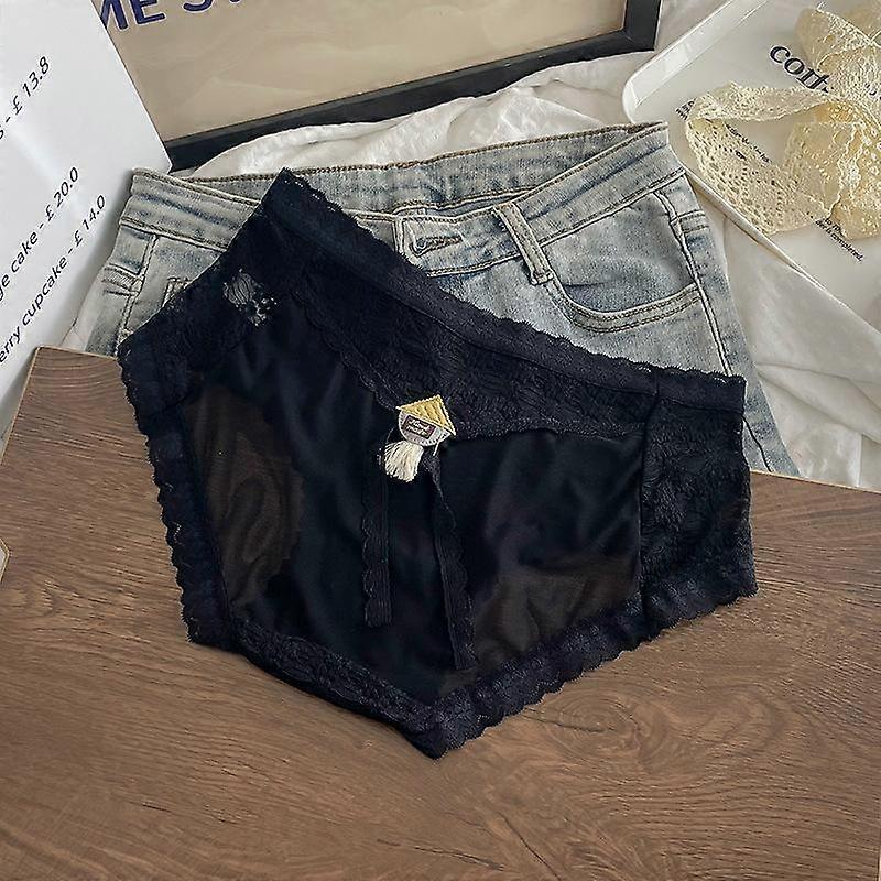 French Satin Lace Underpants Women's Middle Waist Pure Desire Black Sexy Lace Slightly Through Hollow Girls' Briefs
