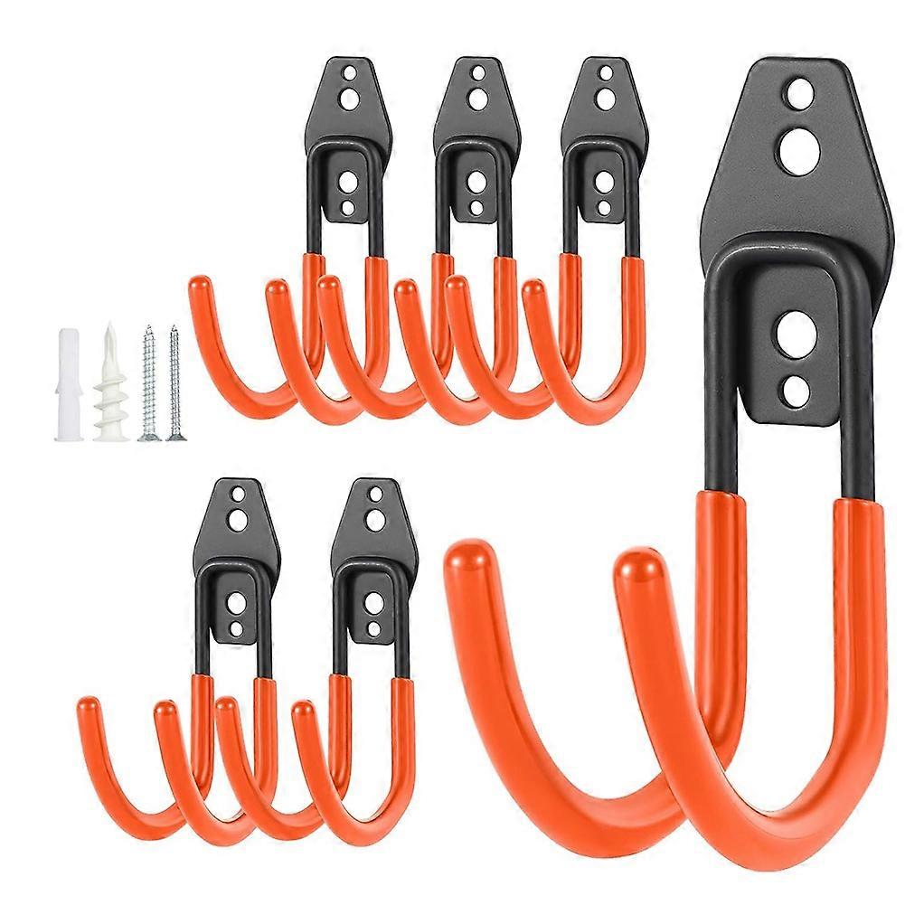 [Premium Materials]Our garage hooks made of tough metal, rustproof and thickened, durability and last long. Ideal choice for indoor or outdoor tool storage. [PVC Coating Design]The thick rubber coating on our gagage hooks provide a better grip on the item being hung and prevent it from falling or scratching. The tubular double hook design makes the gagage hooks more stable than regular single hooks. [Easy to install]The ladder hooks is equipped with 2 types of screws, including screws and wall plugs, which can be applied to concrete walls, wooden walls and brick walls. The ladder hooks are easily and securely mounted using only a drill, hammer and screwdriver. [Multiple Uses]The hose hook can be effectively used to save space for garden, yard, garage, basement, shed and so on. One hook can hold up to 66lbs, it can safely hang bulky tools, such as folding ladders, bicycles, weed whackers, power tools, etc. Colour:Orange Material:Metal Package Contents: 6 x Storage Hooks 24 x Screws 24 x Wall Plugs
