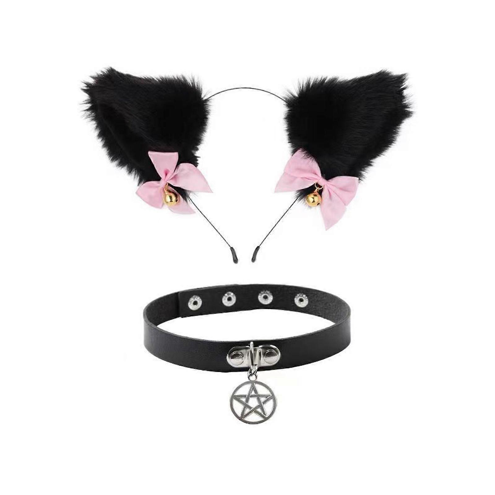 Cat Wolf Dog Ears Shape Hairhoop Cosplay Costume Choker Headdress with Bell Decor Halloween Birthday Party Set for Kids