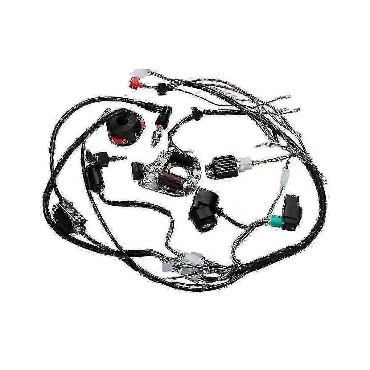 Feature: and high quality, This wire harness kit is designed for ATV electric start assembly Fitment: Suitable for 50cc 70cc 90cc 110cc 125cc Chinese Electric start Quads No instruction is included. Professional installation is Highly Recommended Note: 4 Coil Pole Flywheel Stator,Please confirm with the picture Complete Wiring Harness Replace : 50cc 70cc 80cc 90cc 110cc 125cc Atv Wiring Harness, Wiring Harness,Scooter Wiring Harness,Pit Bike Wiring Harness, Wiring Harness,Go Kart Wiring Harness. Fitment: Fits almost all Chinese made 4 stroke automatic Notice: Complete Wiring Harness Set: To Any Model Above 150CC Before purchasing this harness, please confirm the matching model,Especially The Pictures of Stator. Color: Black Material: plastic Package Contents: 1 x Electric Wiring Harness set Only the above package content, other products are not included. Note: Light reflection and different displays may cause the color of the item in the picture a little different from the real thing. The measurement allowed error is +/- 1-3cm.