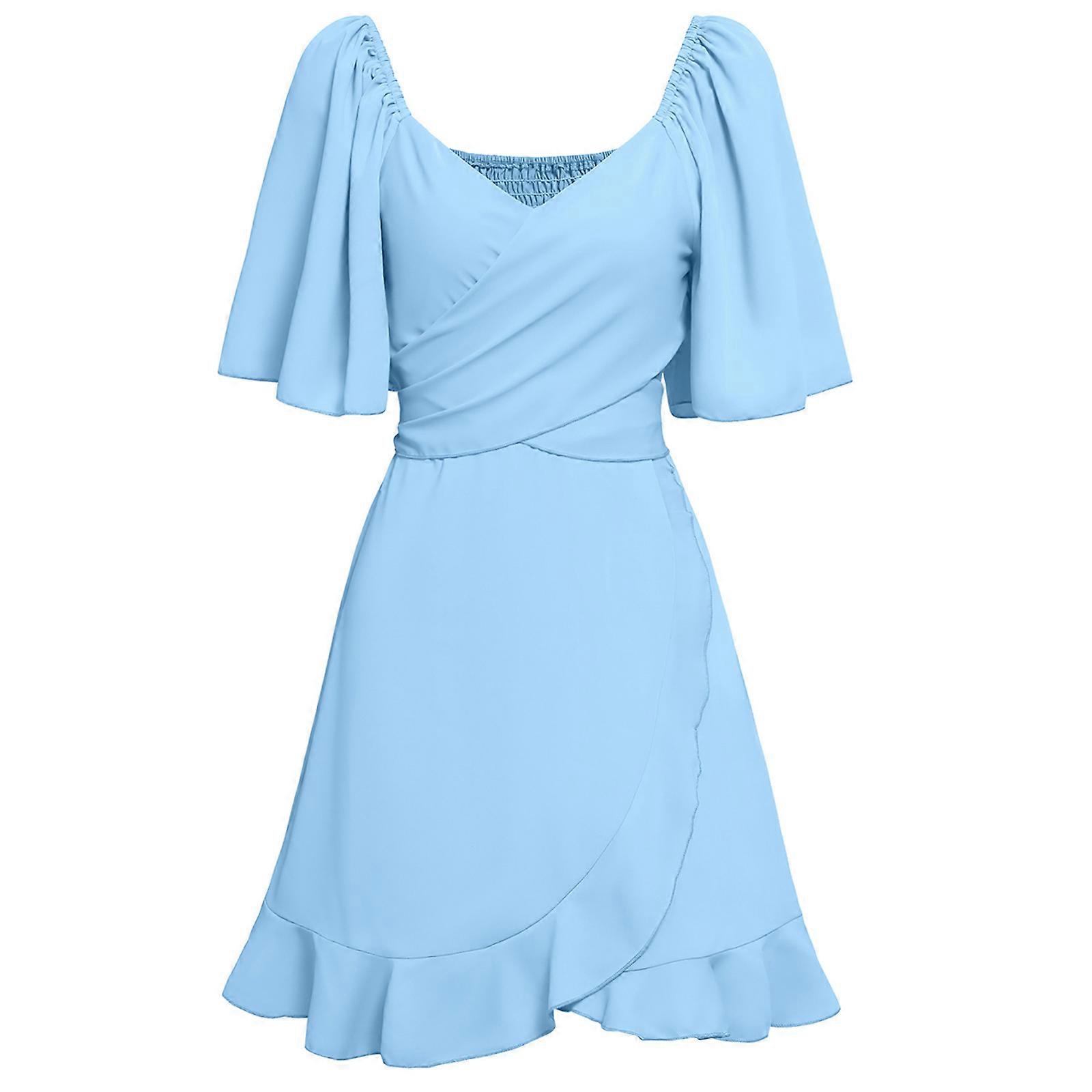 Women Summer Mini Short Dress Bohemian Casual Flowy Swing Dresses Sexy Wrap V Neck A Line Dress with Belted light blue XL