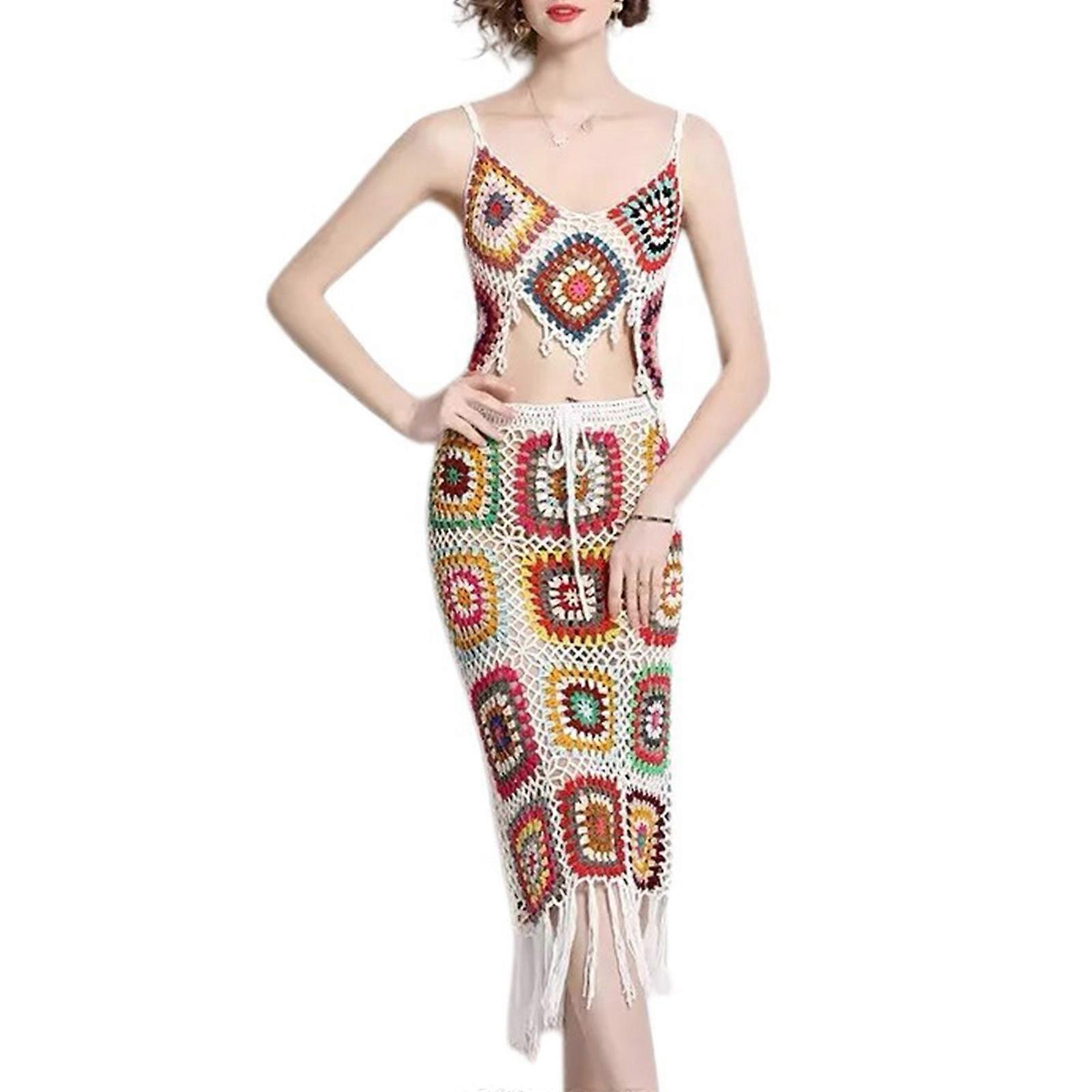 Women 2Pcs Beach Outfit Set Hollowed Out Crochet Knit Cami Crop Top and Drawstring Waist Tassels Skirt Swimsuit Cover Up White