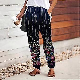 Women 3D Blue Crystal Flower Print Pants Lace Up Elastic Waist Loose Trousers Casual Long Pants Trousers with Pockets