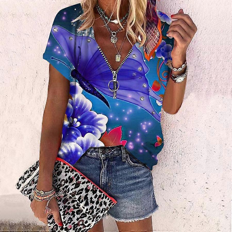 Women's Top Summer New Fashion Rose Flower Gorgeous Flowers Printed Casual Zipper V-neck Short Sleeve Top