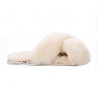 Women's Sheepskin Slippers Beige Slip-On Warm Winter Fur Crossover Non-Slip Comfort