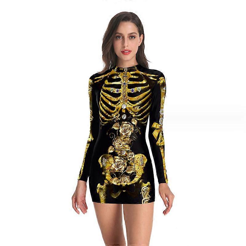 Women's Halloween Costume Skeleton Dress Long Sleeves Stretchy Short Mini Dress