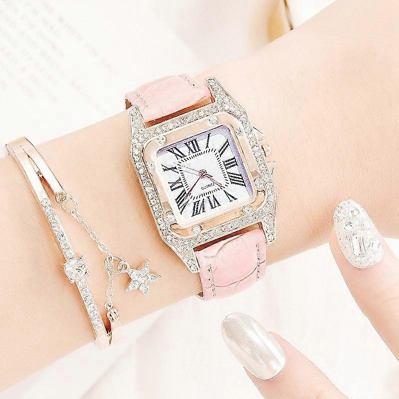 Women Tonneau Square Strap Quartz Watch, Color: Pink+Bracelet Pink+Bracelet