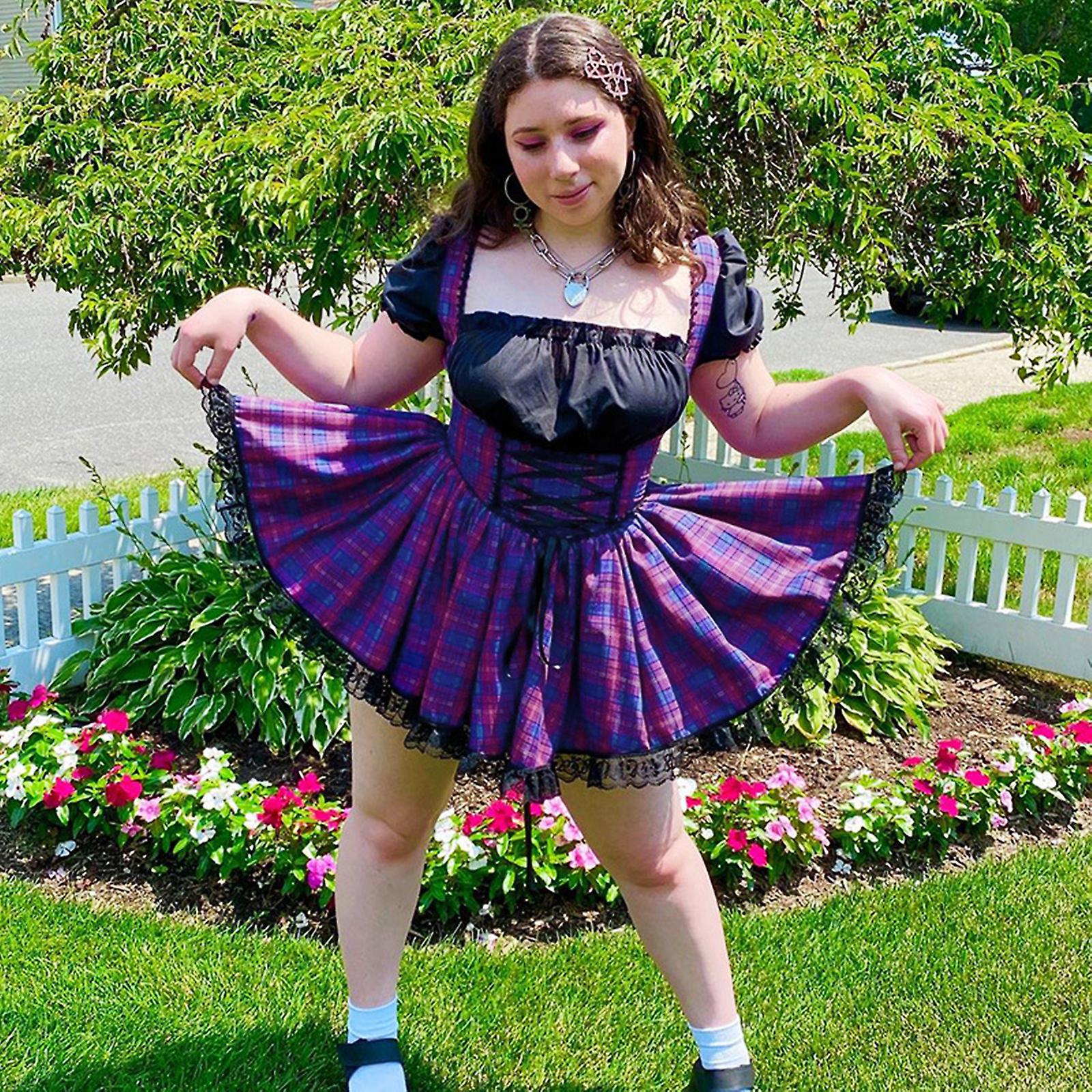 Women Puff Short Sleeve Plaid Print Lace-Up A-Line Pleated Ruffled Mini Dress