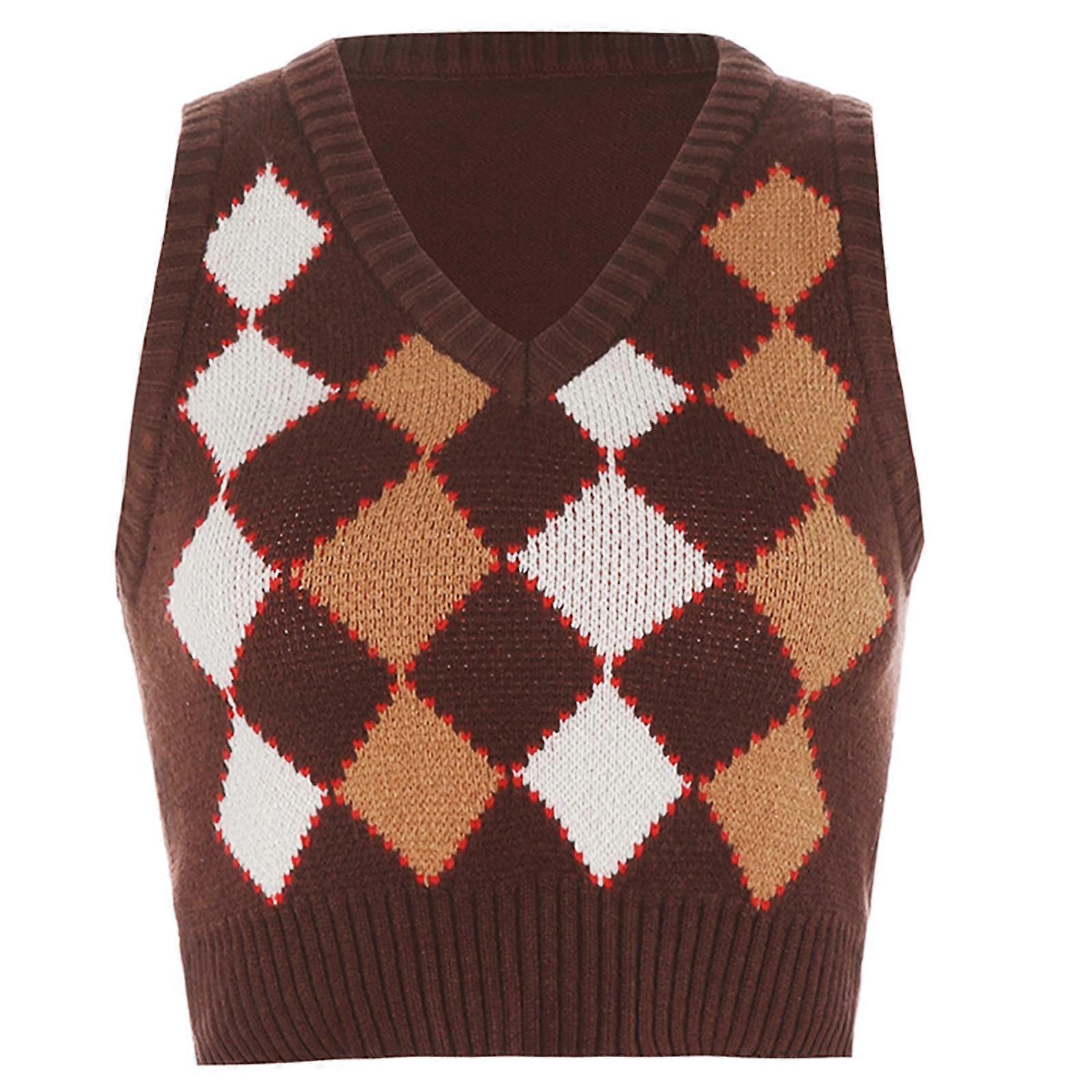 Women Contrast Color Brown Argyle Knitted Vest 90s Vintage Preppy Style Sleeveless Sweater Autumn V-Neck Slim Pullover C S
