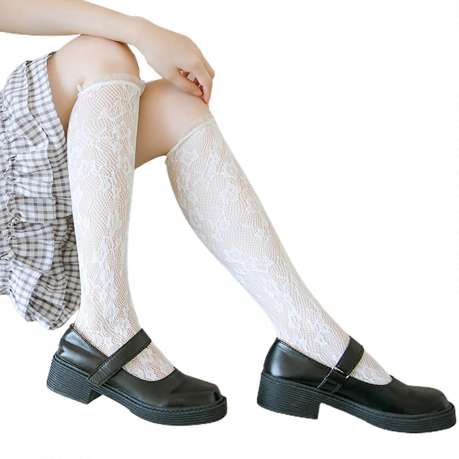 Women Sweet Girls Fishnet Lace Knee High Socks Vintage Flower Vine Jacquard Patterned Ruffle Trim Lolita Calf Stockings