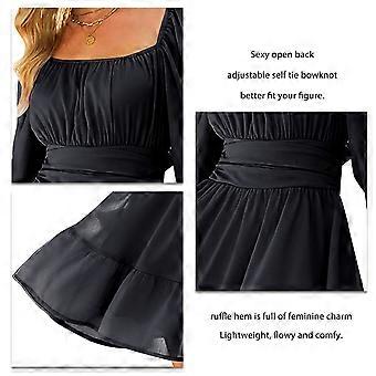 Women Tie Back Puff Long Sleeve Square Neck Ruffle Dress Off Shoulder Solid Color A Line Casual for Party Date Beach Black L