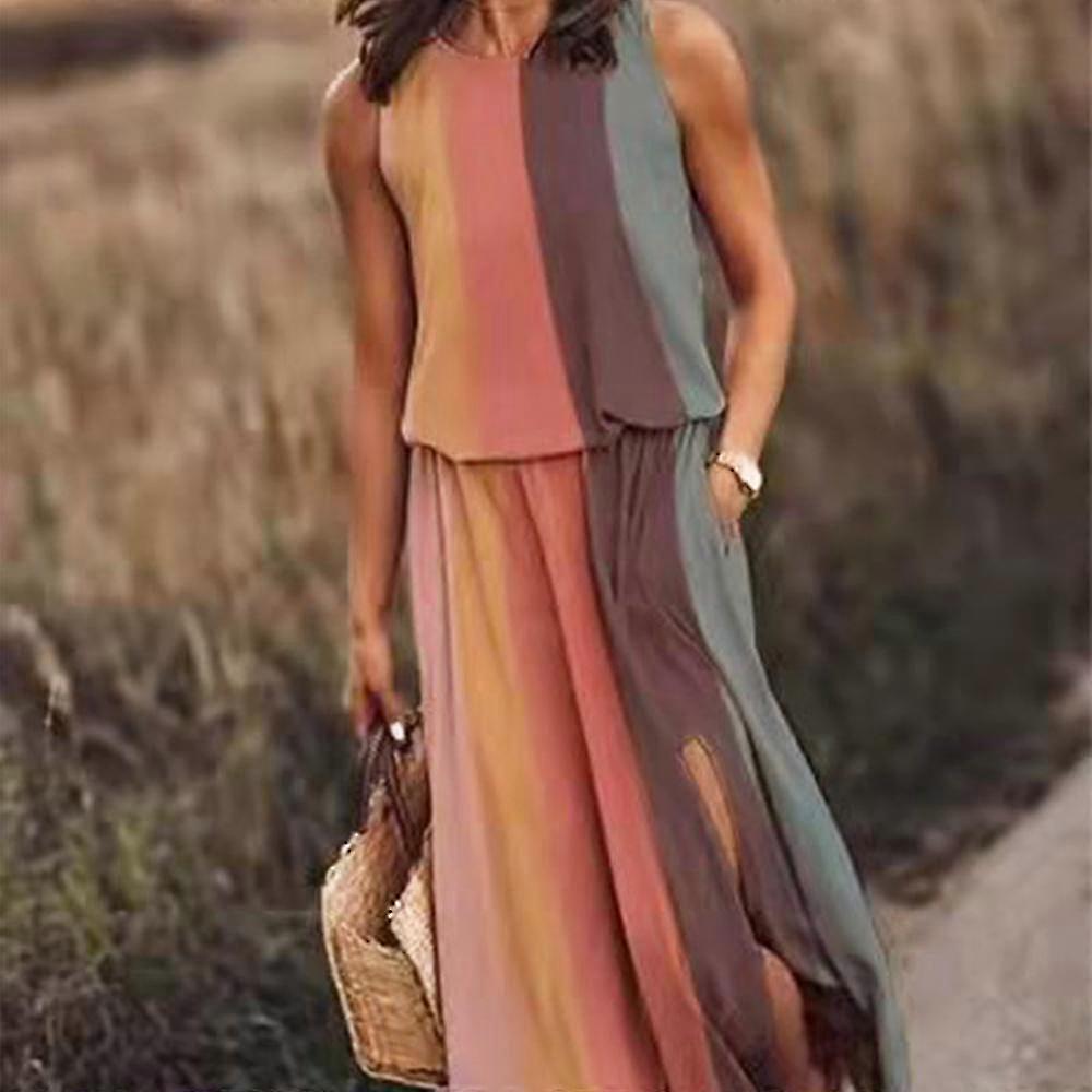 Women Summer Dress Side Split Crew Neck Printed Loose Sleeveless Maxi Dress