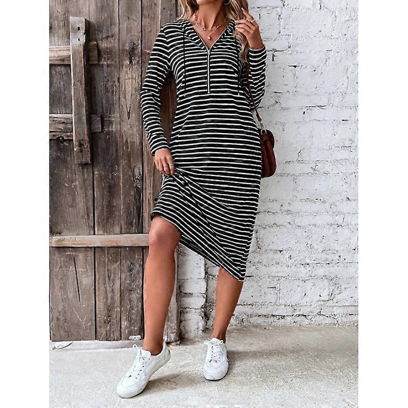 Women Long Sleeve Pullover Hoodie Dress Stripe Pocket Slim Sweatshirt Casual Maxi Dress