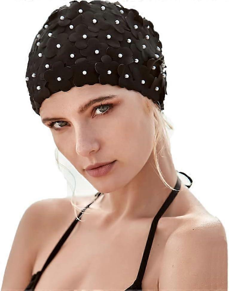 Women Retro Swim Cap, Floral Petal Bathing Cap Long Short Hair Elastic