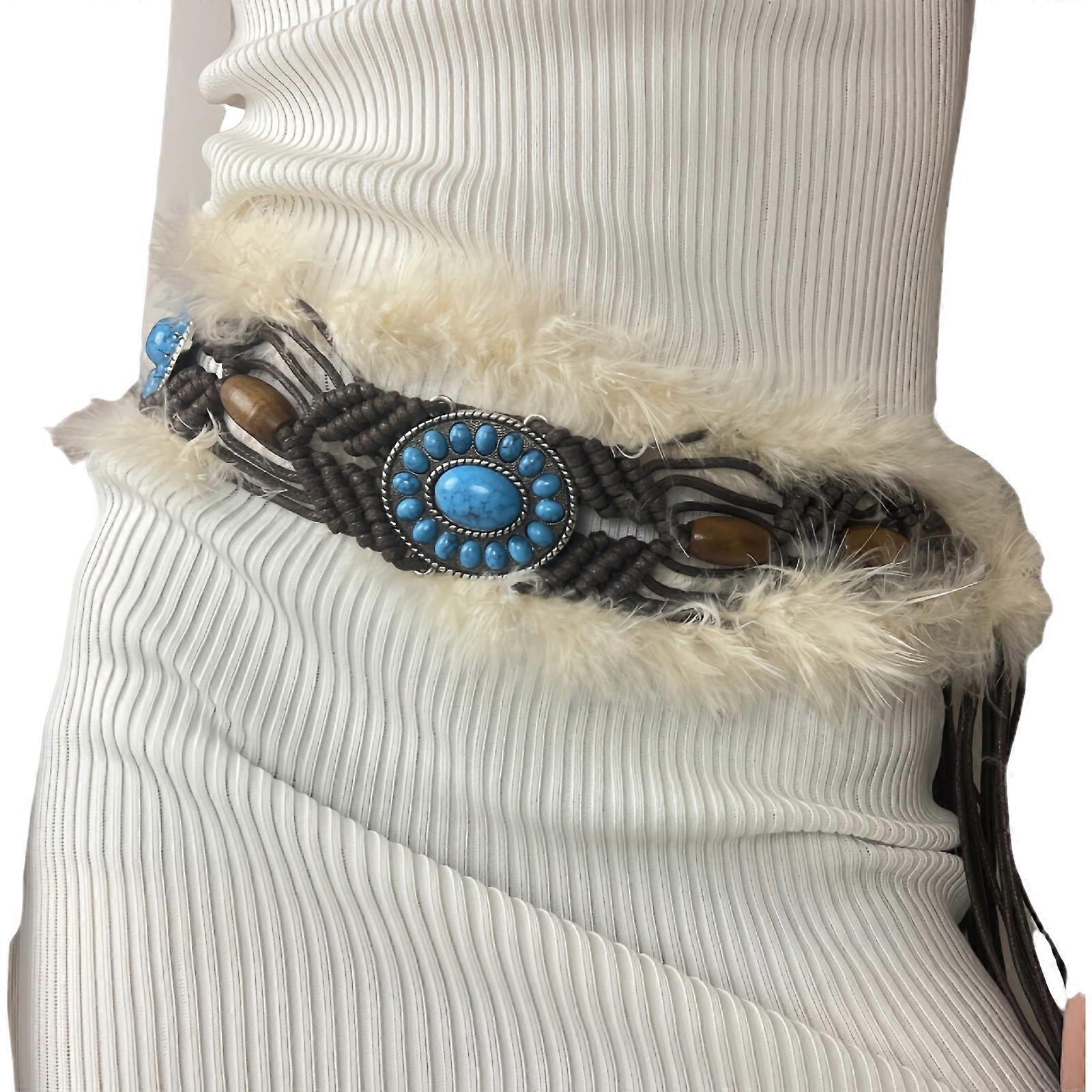 Women Turquoise Wax Rope Belt Bohemian Fringed Belt for Dress Sweater Accessory Ethnic Waiststrap Female Waist Ornament coffee