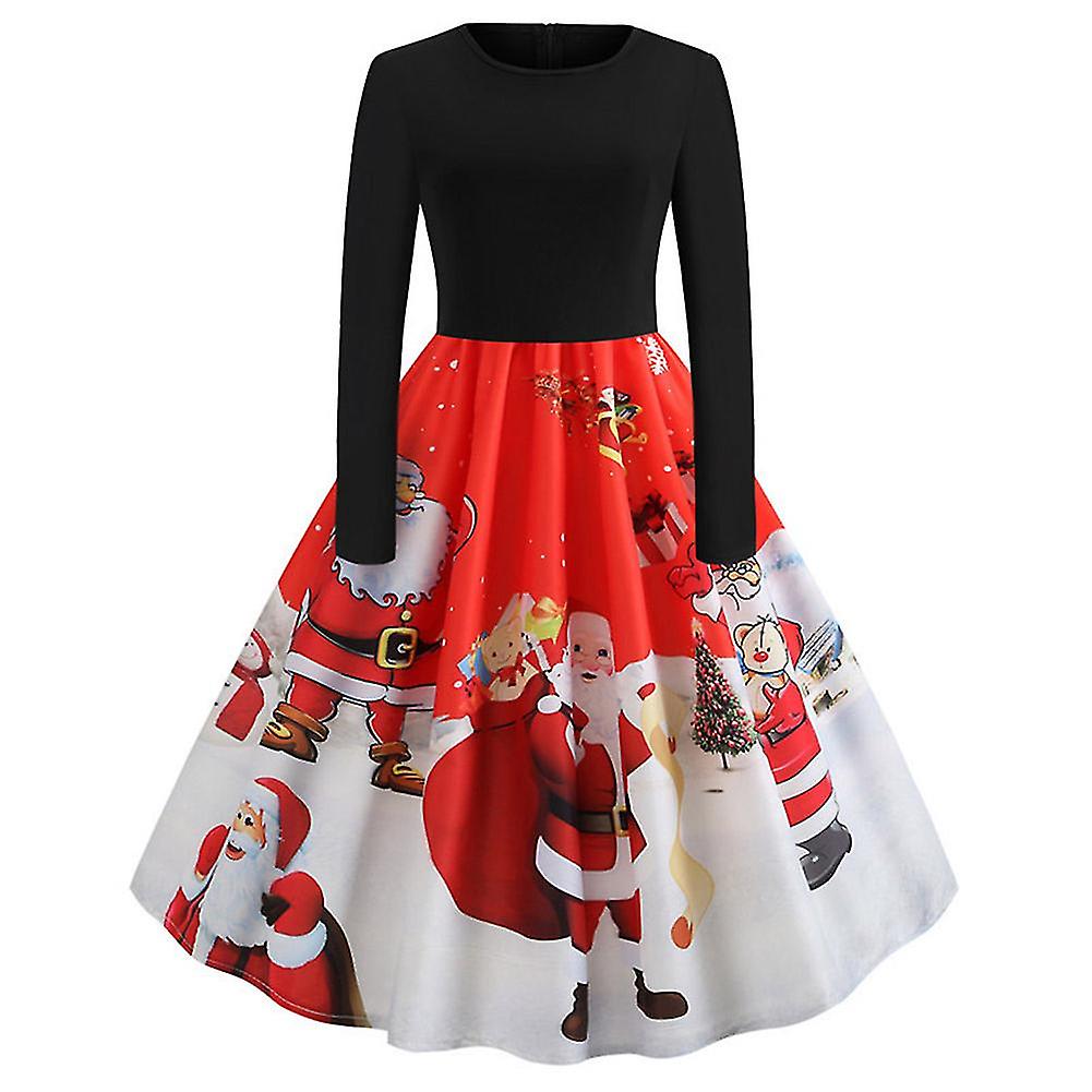 Women Christmas Print Dress Vintage Round Neck Long Sleeve Large Swing Formal Dress Party New_y
