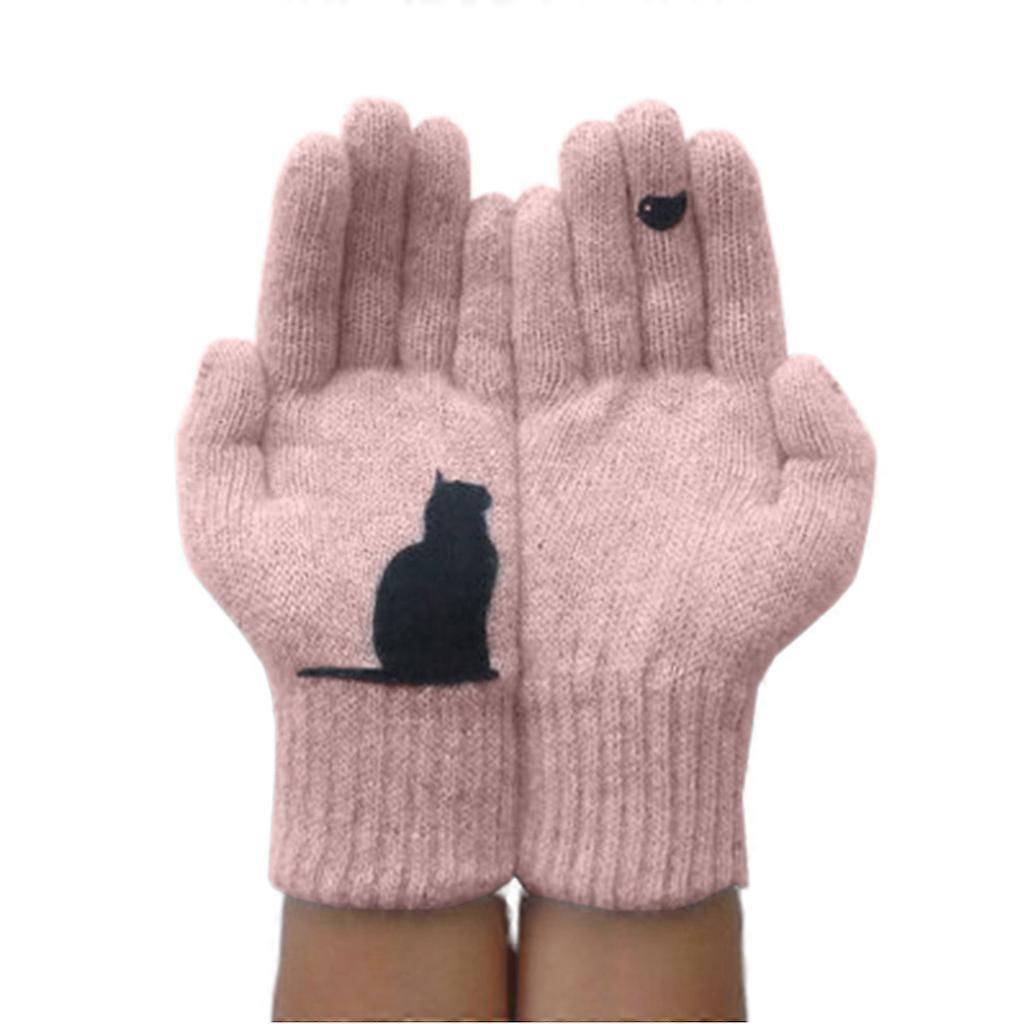 Women Full Finger Gloves Winter Cute Cartoon Patchwork Stretchy Knitted Thermal Gloves Imitation Wool Short Hand Warmer PINK