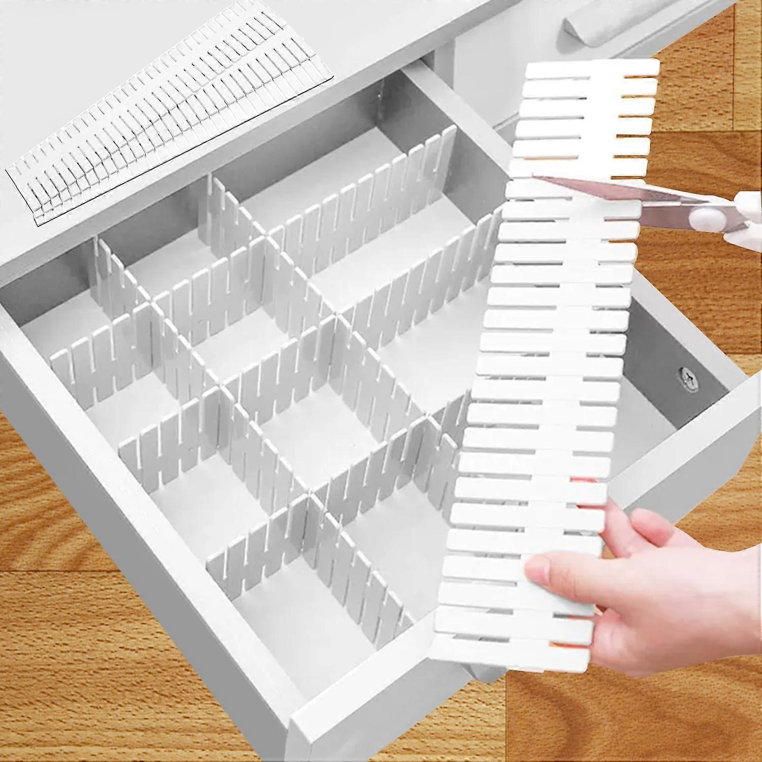 Bedroom Drawer Dividers for Office 16 Pack Drawer Organizers Kitchen and Makeup (White) <ul class="a-un0rdered-list a-vertical a-spacing-mini"> <li class="a-spacing-mini"><span class="a-list-item">Material: The white drawer dividers are made of high-quality PP material, which is safe and environmentally friendly, sturdy and durable, and can withstand the use of dairy products. High-quality plastic drawer dividers, flexible, sturdy, easy to assemble and disassemble, you can assemble them into different shapes and sizes. </span></li> <li class="a-spacing-mini"><span class="a-list-item">DIY Drawer Organizers: 16 pieces of white drawer organizers with fixed buckles, connecting buckles, and triangle buckles, which can effectively manage drawer space and store small items such as underwear, socks, ties, belts, watches, etc.; create a more tidy and organized space, allowing you to see at a glance and save time. </span></li> <li class="a-spacing-mini"><span class="a-list-item">Size: 32 x 7 cm. Flexible and adjustable drawer dividers not only save you time and space when searching for items, but also keep your drawers tidy. No nails or glue required, you can install them yourself and arrange them into various shapes. </span></li> <li class="a-spacing-mini"></li> </ul>