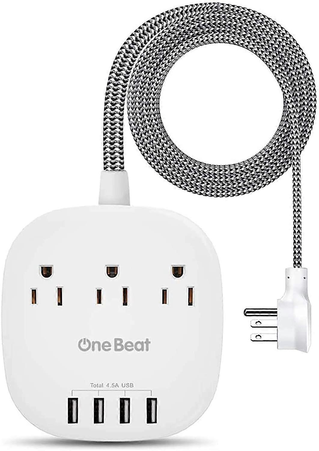 Flat Plug Power Bar with 4 USB Ports, Power Strip with 3 Outlet Charger, Surge Protector Charging Station with 5 Feet Extension Cord for Home, Office,