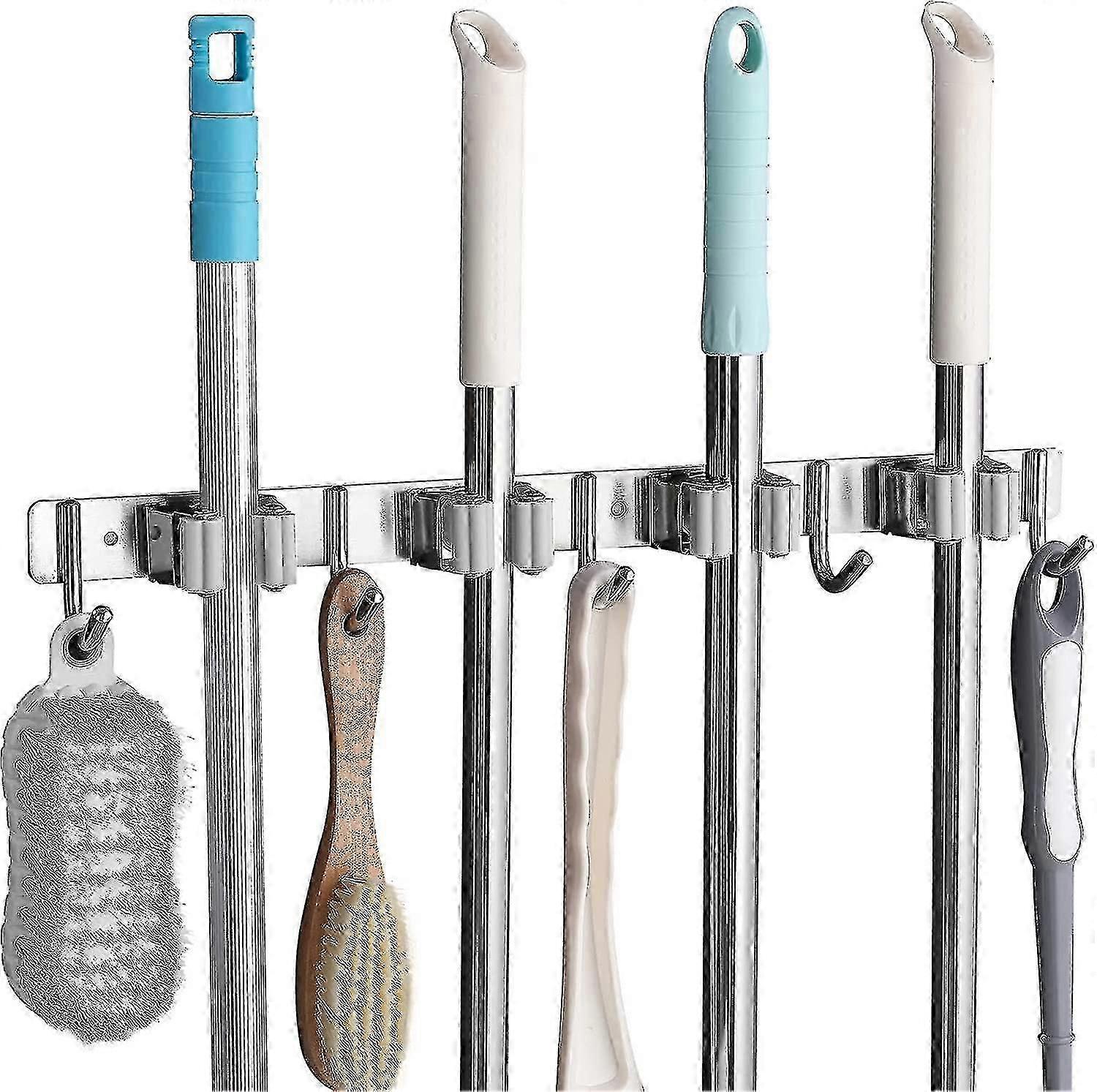 Wall Mounted Stainless Steel Broom Holder Wall Mounted Broom Holder With 4 Slots And 5 Hooks For Kitchen, Bathroom, Garage And Garden, Grey-- Crjjkoy