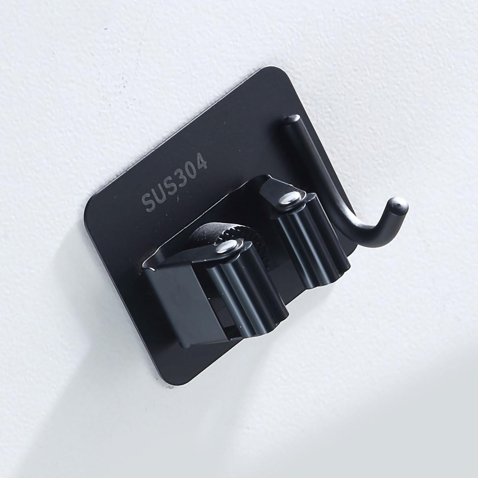 Wall Mounted Mop Clip Stainless Steel Punch Free Glue Installation Multifunction Mop Broom Holder for Bathroom Toilet Large Squares, Black, with Hook