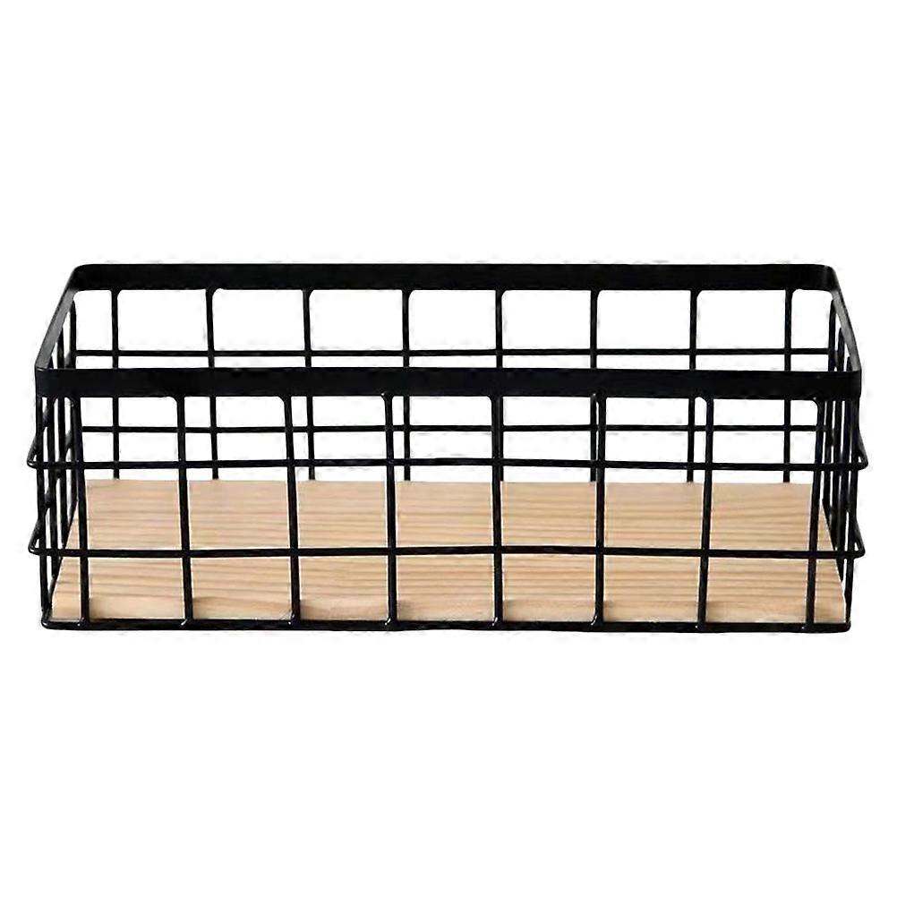 Wall Mounted Iron Art Storage Basket with Wooden Board, Large Black Hollow Organizer for Kitchen, Bathroom, Bedroom, Space Saving Simple Holder for