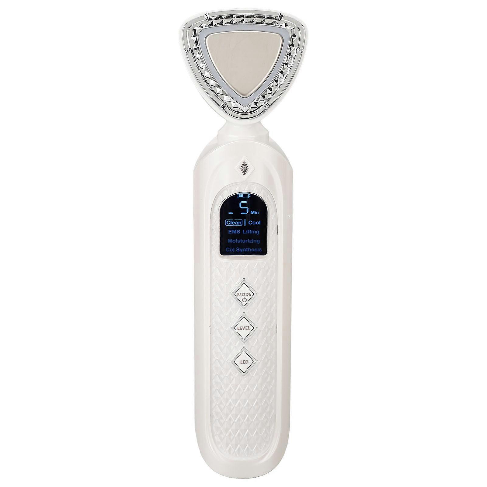 Feature: 1. CLEAN PORES: Acoustic micro vibration technology, fitted to the face with intelligent design, deathless comprehensive cleaning of your skin. 8000 times per minute, high frequency vibration, vibrate out deep pore oil, deep clean every pore. Pores are light and transparent, skin is delicate and smooth. 2. REDUCES WRINKLES: Repeated contact with the skin at 42 degrees Celsius helps produce HSP protein, which repairs skin cells, enhances skin elasticity and resists the formation of wrinkles. 3. EMS: Myoelectric stimulation EMS, activates skin cells, stimulates collagen regeneration, enhances skin elasticity, softens wrinkles, and makes skin smooth and healthy. 4. TIGHTENS SKIN: Helps firm skin, maintains elasticity and prevents problems such as allergies. Shrinks pores, locks in moisture, soothes sore muscles and reduces skin fatigue. 5. BRIGHTEN SKIN TONE: Alternating warm freeze skin care stimulates the circulation of fluid in the bottom layer of the skin and accelerates cell metabolism. Effectively reduces the elimination of dark circles and simple eye lines and brightens the complexion. Specification: Item Type: Hot and Cold Facial Massager Product Color: White Led Color: Red light, blue light Product Gear: 3 gears Product Mode: Clean, Cool, EMS Lifting, Moisturizing, Col Synthesia Product Temperature: 6-42 degrees Celsius or so Product Vibration: About 8000 rpm Use Time: 5 minutes one time or 2 minutes one time Battery Type: Lithium battery Battery Capacity: 1000mAh (shipped with built in battery) Power Supply Type: USB data cable Charging Time: 3.5 hours Standby Time: 90 days Steps to Use: 1. Please fully charge before the first use. Charging time is about 3.5 hours. Long press the power button MODE 2 seconds to turn on the machine, the default cleaning mode is level 1, at this time the beauty instrument vibration heat. According to own skin needs, press the level key to adjust the temperature. (Mode 1 intelligent timing 5min). 2. Press MODE key to enter the cooling mode, the beauty instrument vibration work, cooling. According to own needs, you can adjust the temperature by level (2min intelligent timing) 3. Press MODE key, enter EMS lifting mode. The beauty instrument vibrates to produce high EMS micro current. According to own needs, you can adjust the EMS level by level key (mode 3 intelligent timing 5min). 4. Press MODE key to switch to moisturizing mode. The beauty instrument vibrates and generates heat, sending EMS micro current to the skin. Adjust the EMS strength by level key according to individual needs (mode 4 intelligent timing 5min) 5. Press MODE to switch to collagen synthesis mode. The beauty instrument vibrates and cools while sending out EMS micro current to the skin (same as model 2 2min smart timing) You can adjust the EMS strength according to your own needs by pressing level (mode 5 smart timing 2min). 6. In each mode press led key to adjust the LED photons. Usage: Clean: Need to be used with makeup remover pads. Remove the makeup ring, stick on the cotton pad and pour in makeup remover water. Then turn on Clean mode to warm open pores, crush dirt and export deep waste. Clean pores and say goodbye to blackheads! Cool: Put the mask on your face and turn on the cool mode. The cool function effectively shrinks pores and locks in skin moisture. EMS Lifting: After cleansing, apply skin care products to the face and turn on EMS mode. EMS stimulates the muscles and makes the skin more energetic and elastic. Improves facial fine lines, removes crow's feet and wrinkles, restores youthful, smooth and supple skin. Moisturizing: After cleansing, apply lotion, serum and other skin care products to your face to activate the moisturizing mode and promote double absorption of skin care products! (In each mode, you can choose red, blue light according to your skin needs) Col Synthesia: After skincare products are absorbed, the collagen synthesis mode is activated to cool and shrink pores and lock in nutrients. EMS micro current stimulates skin cells to synthesize collagen, rejuvenate muscles and fight wrinkles. (Each mode can choose red, blue light according to skin needs). Package List: 1 x Host1 x Base1 x Fixing Ring1 x Instruction Manual1 x USB Cable Note: 1. The product cooling power consumption is relatively large, high heat generation, after shutdown need to be placed about 10 minutes before using the ice function.2. When the host is working, the battery icon on the screen flashes 5 times (while the buzzer "down" 5 times), and then shut down, indicating that the machine is low on power. Please charge the machine in time.3. When the host is placed on the charging base, the charging buzzer "drip" sound is detected, indicating that the charging state.