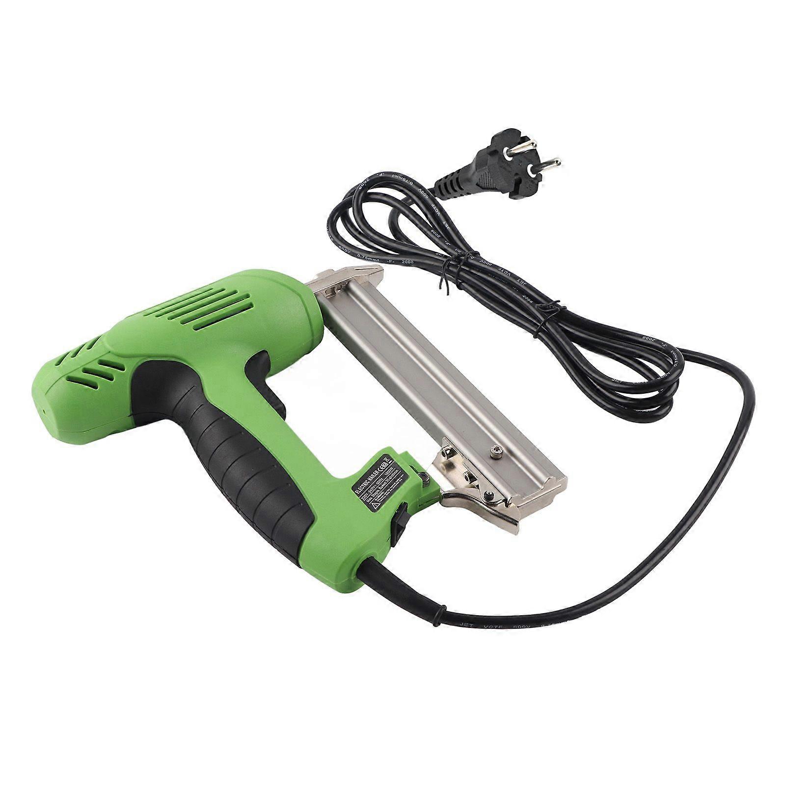 Feature:1. High Strength Aluminum Alloy Construction: Crafted from high strength aluminum alloy, this wired electric nailer is both lightweight and exceptionally rugged. Its high hardness ensures that it can withstand demanding tasks without bending or breaking, making it a good tool for various projects.2. Ergonomic Design: Designed for user comfort, the straight nail gun features a soft grip handle that minimizes fatigue, even during prolonged usage. This ergonomic design allows for greater control and efficiency, enhancing the overall experience for professionals and handcraft enthusiasts alike.3. Convenient Electric Operating: This electric stapler operates directly on standard household electricity. This convenience eliminates the need for bulky hoses and reduces noise, making it a good choice for both indoor and outdoor projects.4. Time Saving Efficiency: The electric nail gun is designed to save you time and effort, allowing you to complete your projects more quickly and efficiently. Its easy to use functionality enables both novices and experienced users to tackle a variety of tasks without unnecessary complications.5. Versatile Application Range: Suitable for a wide array of projects, this corded nailer excels in securing lightweight decorative trim, picture frames, pet houses, and more. Whether you are working on roofing, furniture assembly, flooring, or upholstery, this tool is designed to meet all your nailing needs, offering versatility and reliability in one package.Specification:Item Type: Electric Nail GunFrequency: 50HZBinding Capacity: 100 NailsNail Length: Approx. 30mm / 1.18inNailing Speed: 30/minUse: WoodworkingPower: 1800WApplication: Handcraft Woodworking, Cabinet Making, Box Assembly, Home Decoration, Logistics Shelving.Package List:1 x Nail Gun1 x Screwdriver2 x Hex Wrenches1 x Manual