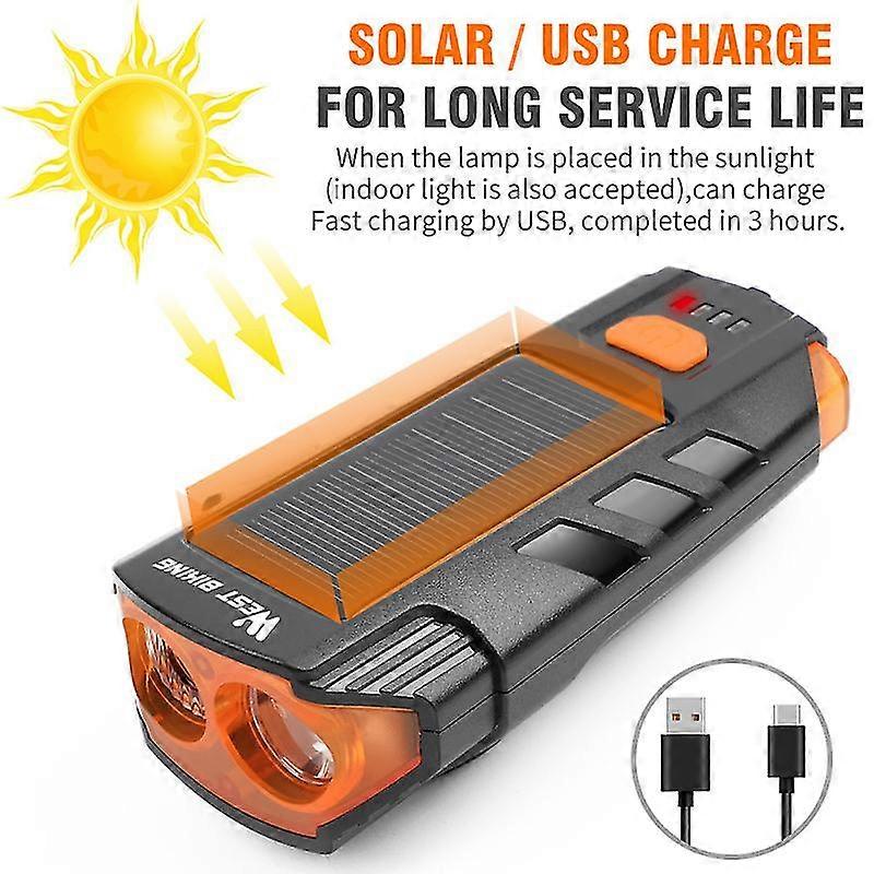 Solar Power Bicycle Light Usb Rechargeable Led Cycling Headlight Waterproof Bike Horn Warning Lamp