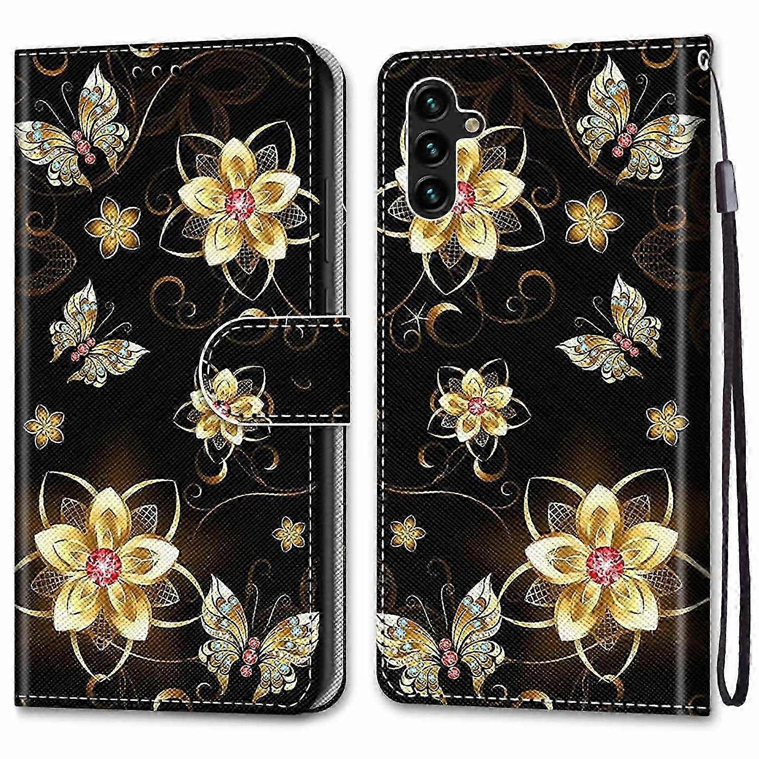 Wrist Strap Pattern Printing Anti-scratch Cross Texture Stand Wallet PU Leather + TPU Phone Cover for Samsung Galaxy A13 5G/A04s 4G (164.7 x 76.7 x 9.1 mm) - A15 Gold Diamond Butterfly ?Distinctive pattern, adds more stylish elements to the device ?Cross texture features good hand-hold feeling, leave no fingerprint ?Quality PU leather and TPU material, durable for long time use ?Built-in 3 card slot + 1 cash pocket, convenient for carrying your belongings ?Foldable stand with adjustable angle for convenient viewing ?Magnetic clasp closure adds security to your cards and cash ?Provide full body protection against scratches ?Easy access to charging ports, speaker, and other functional features ?Reserved front cutout allows for answering phone calls with case closed ?Come with a wrist strap, carry this phone case easily Package included: ?1 x Pattern Printing Leather Wallet Case ?1 x Wrist Strap ?Other items not included