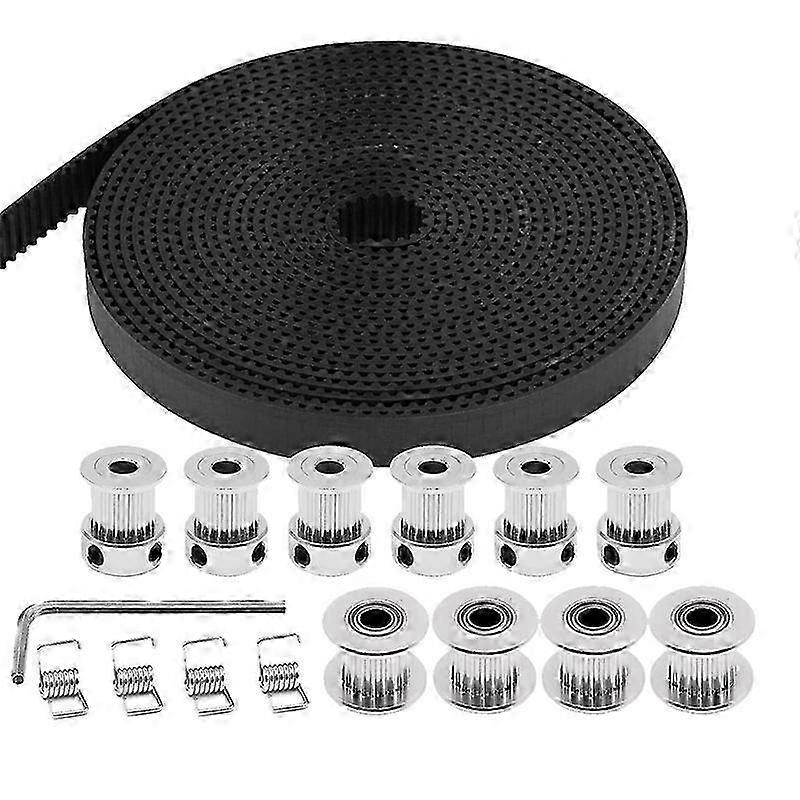 The timing belt is made of high-quality Material, which is and flexible. Designed for linear motion, high positioning accuracy. The round tooth profile ensures a smooth fit of the belt teeth. Most 3D printers are popular.<br> The timing pulley is made of high-quality Material, which is well-processed and has a smooth . The timing pulley has 20 teeth in contact with the belt, minimizing the risk of belt slippage.<br> The timing belt idler pulley is made of high-quality Material with high hardness and anodized treatment, which is effectively waterproof, rust-proof, -, and more beautiful and .<br> The locking spring is made of high-quality Material, which has resistance and high strength, using the spring can increase the proper tension and make the printing more precise.<br> mounting module that mounts to the open buckle on 2GT belts (and some other models); keeps secure without loosening.<br> Material: aluminum+rubber<br> colour: black+silver<br> Package Contents:<br> 1 x 5M Timing Belt 10mm Width<br> 6 x 20 Teeth 5mm Bore Timing Pulley Wheel<br> 4 x 20 Tooth Bore 5mm Idler<br> 4 x Tensioner Spring Torsion<br> Only the above package content, other products are not included.<br> Note: Light reflection and different displays may cause the color of the item in the picture a little different from the real thing. The measurement allowed error is +/- 1-3cm.