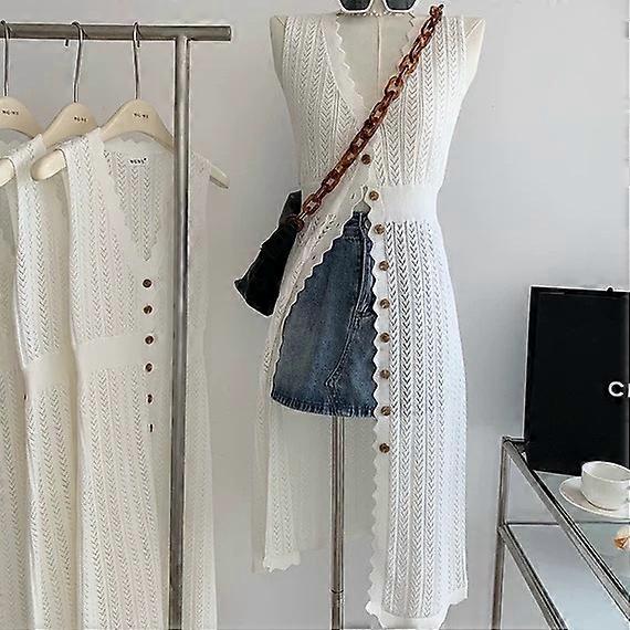 Summer Cardigan Dress Sleeveless Knit Sweater V-neck Mid-length Lace Women Hollow 2024 Korean Chic Knit Button Cardigan