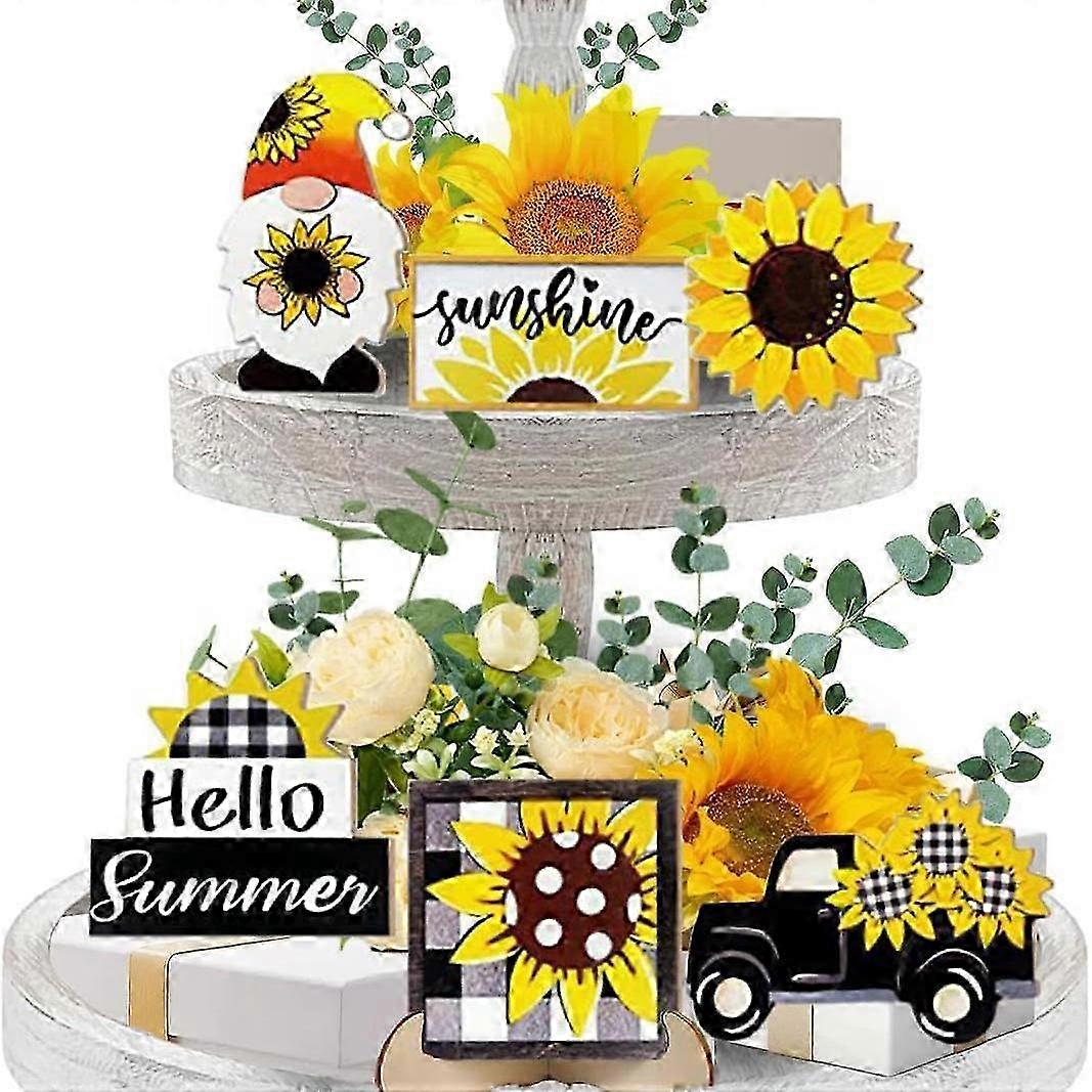 Summer Tiered Tray Decor, Farmhouse Sunflower Tray Decorations, Hello Spring Summer Sunflower Gnome Sunshine Truck Wooden Signs, Buffalo Plaid Rustic