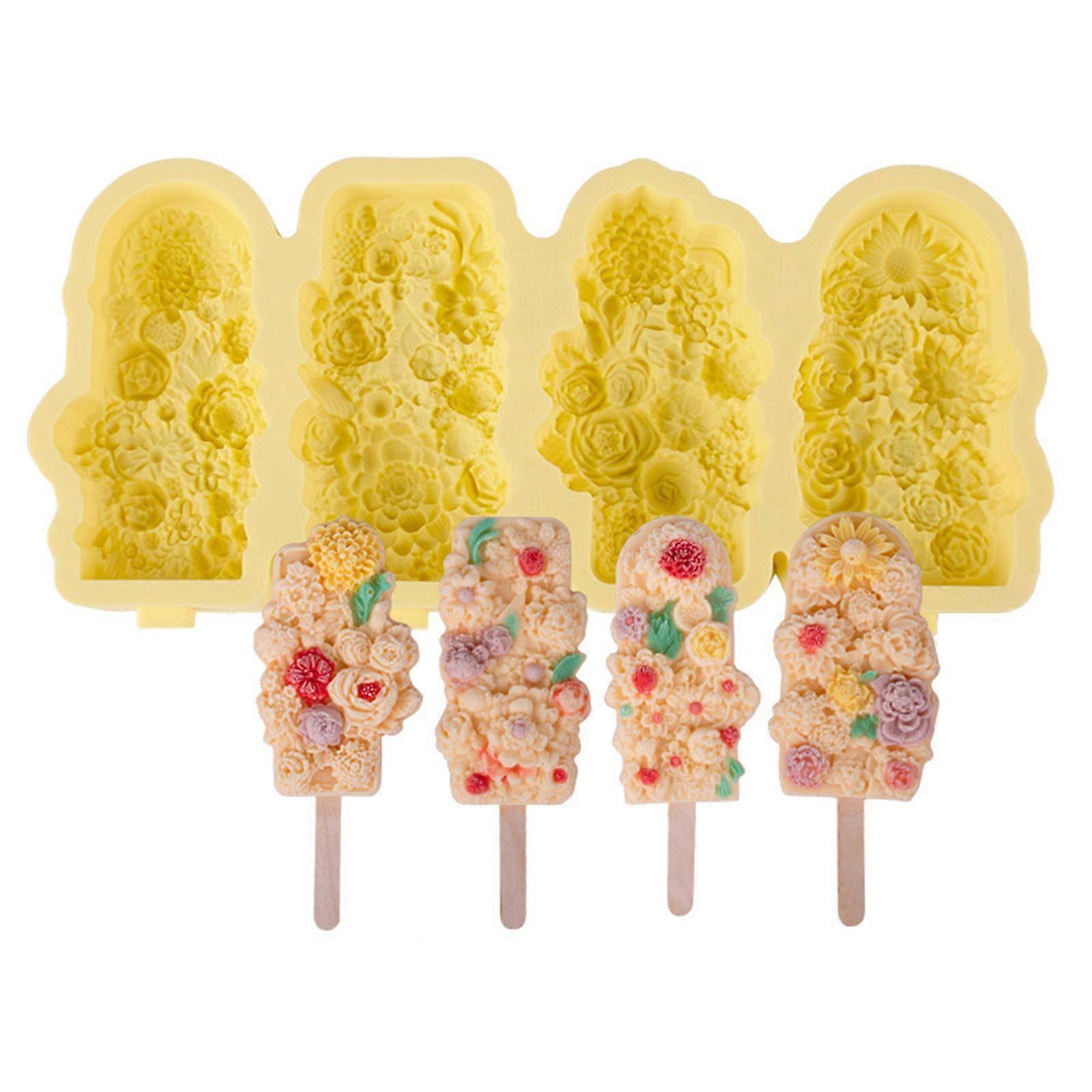 Silicone Popsicles Molds 4 Cavities Flower Shape Ices Cream Mold Freezers Ices Mold Cake Candy Candy Mold Nonstick Yellow