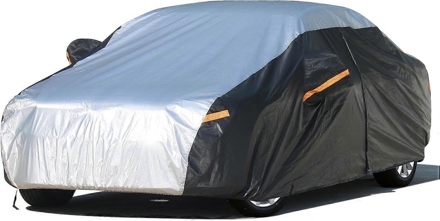 Fashion Style: After optimizing and upgrading, car cover adopts Black and White color design to make your car unique in many cars. The novel and beautiful cover is more recognizabl in other single color car cavers.Upgraded Design 1). With a Door Zipper on the left of the cover for easy access. 2). 3 Windproof Straps at front & medium & rear to fix your car cover in heavy wind weather. 3). The Elastic Bands design can better fix the car cover and is easy to install. 4). Pretty Mirror Pockets make the car cover more suitable. 56 Reflective Stripes Warn People and other cars in the Night.Applicable ModelsFit Sedan-Length (190" to 209").Suitable for Dodge Charger/Challenger, Lincoln Mkz/Mks/Continental, Jaguar XJ/XF, Toyota avalon/Mirai, Chrysler 300, Tesla Model s, Hyundai Genesis, BMW 7 series, Mercedes S-Class,CT5/CT6/CTS/DTS/STS/XTS/Seville/Deville/Eldorado etc.What you getYou will get 1pc car cover and 1pc storage bag and 12 months full warranty. 2) After receiving the car cover, if you have any size problems or product defects, please contact us in time. We stand behind our products and service.Premium Material Car Covers are made Of 6 Layers Heavy Duty Material, Aluminium*2 & PE*2 & Spunlaced Cloth*2. Aluminum is good at Sunproof, PE is 100% Waterproof, and Spunlaced Cloth protects vehicle paint. Premium materials are more suitable for Waterproof/Dust-proof/Snow-proof/Wind-proof, which can protect your car in any climatic conditions.
