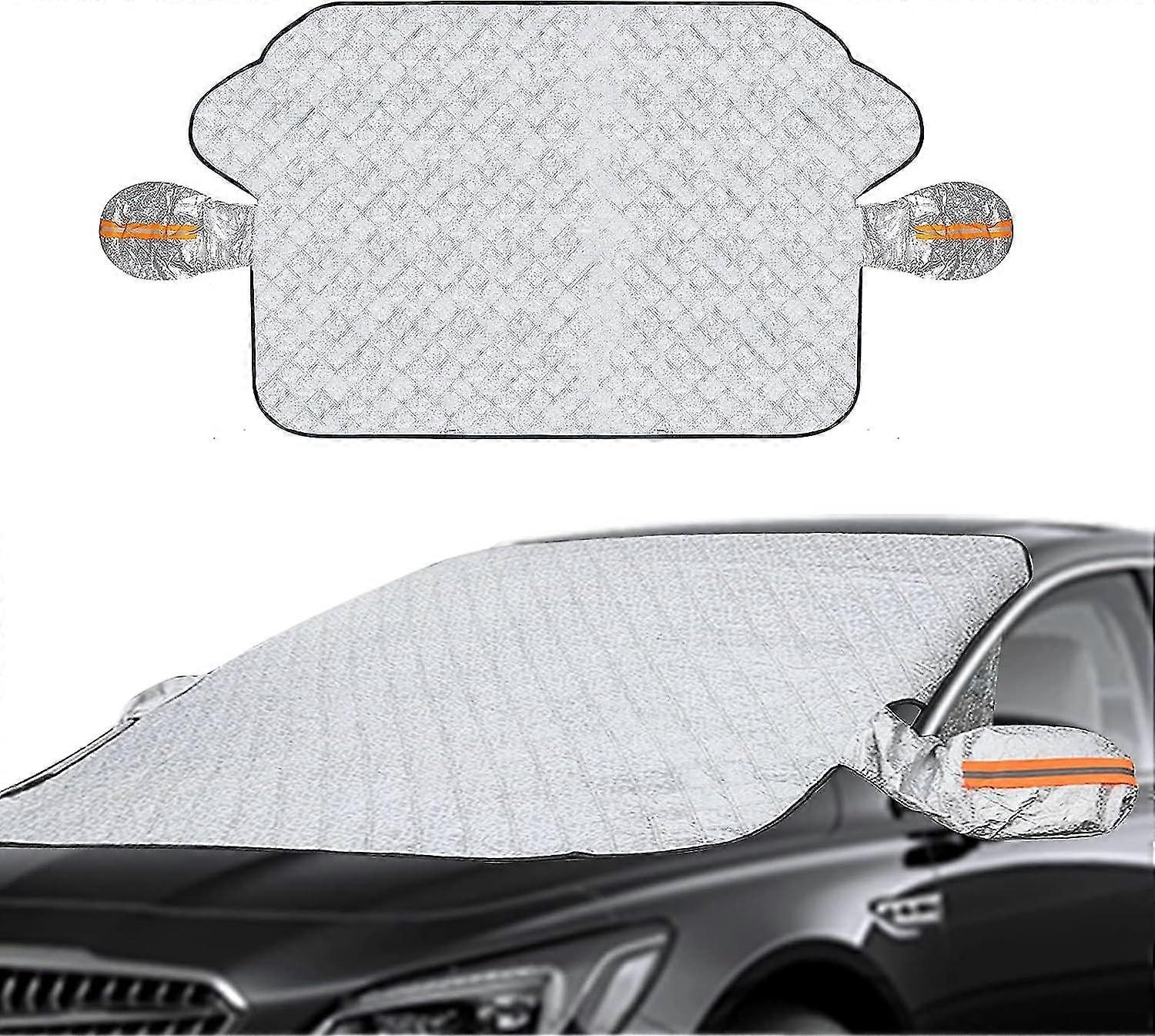 Universal Dimension--- The body size of 145 x 119 cm makes it large enough to cover the entire windshield and wiper. Our car windshield covers are suitable for most cars and SUVs and more.The unique lid design of the side mirror can protect the side mirror from frost and snow in winter. Upgraded Material---Thicken 4 layers to ensure high tear resistance. This anti-frost car windshield cover is made of a multi-layer composite material (PEVA aluminum sheet + double cotton lining + non-woven), durable and tear resistant. Easy to install---This windshield cover can be installed quickly in one minute. Put the cover on your windshield, fix the two wings in the door and fix them securely (the door gasket will not be affected), then wrap the side mirror with the side mirror cover. Works For All Seasons---The windshield cover can protect the windshield from ice and snow in winter and block UV rays and sun in summer. In everyday use, the cover also serves as protection against dirt and dust.
